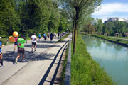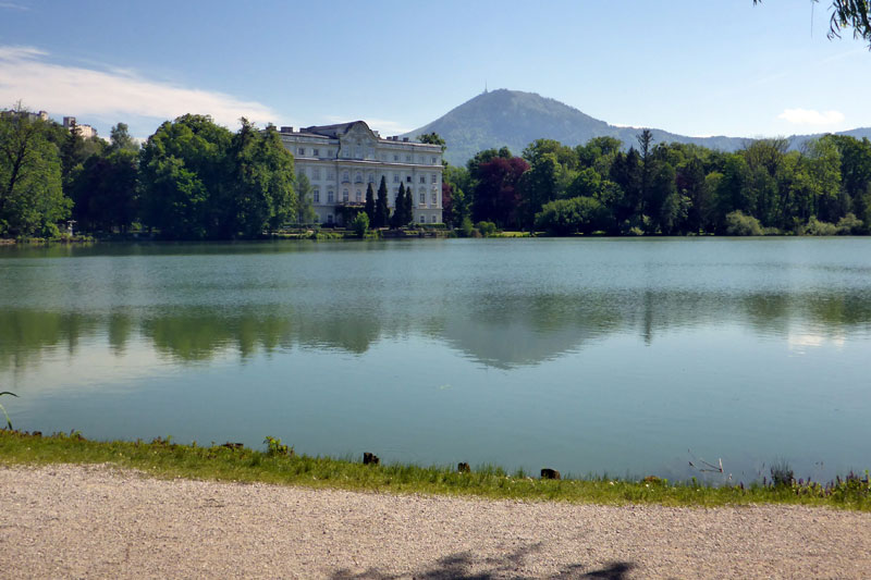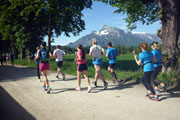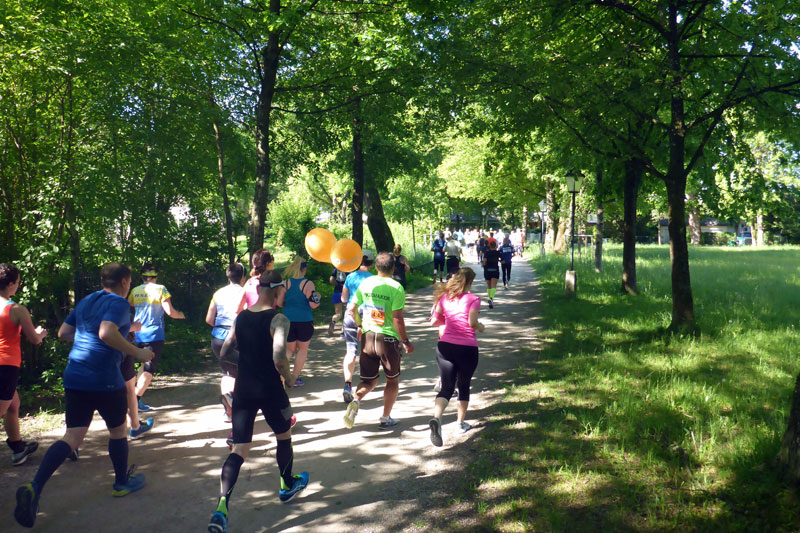 An der Salzach entlang geht es nun erst mal auf der Peterbrunnstraße in Richtung Südosten und der Sonne entgegen. Bald sind die ersten beiden Kilometer abgespult und wir biegen auf die Hellbrunner Straße und laufen auf die Hellbrunner Allee zu. Auf diesen Streckenabschnitt freue ich mich schon ganz besonders. Zweieinhalb Kilometer geht es nun zwischen schattenspenden Eichen auf der Allee, die die Altstadt mit dem Schloss Hellbrunn verbindet, immer geradeaus. Die Hellbrunner Allee wurde Anfang des 17. Jahrhunderts durch Fürsterzbischof Markus Sittikus von Hohenems angelegt und ist heute die älteste erhaltene herrschaftliche Allee Mitteleuropas. Dank des herrlichen Wetters haben wir auch einen wunderschönen Blick auf die teils noch schneebedeckten Salzburger Alpen. Rechterhand passieren wir auch immer wieder Herrensitze, wie das Schloss Fronburg oder das Schloss Emsburg. Jürgen und ich schwärmen schon jetzt vom Salzburg Marathon, obwohl er ja eigentlich noch nicht einmal richtig begonnen hat.