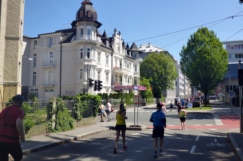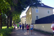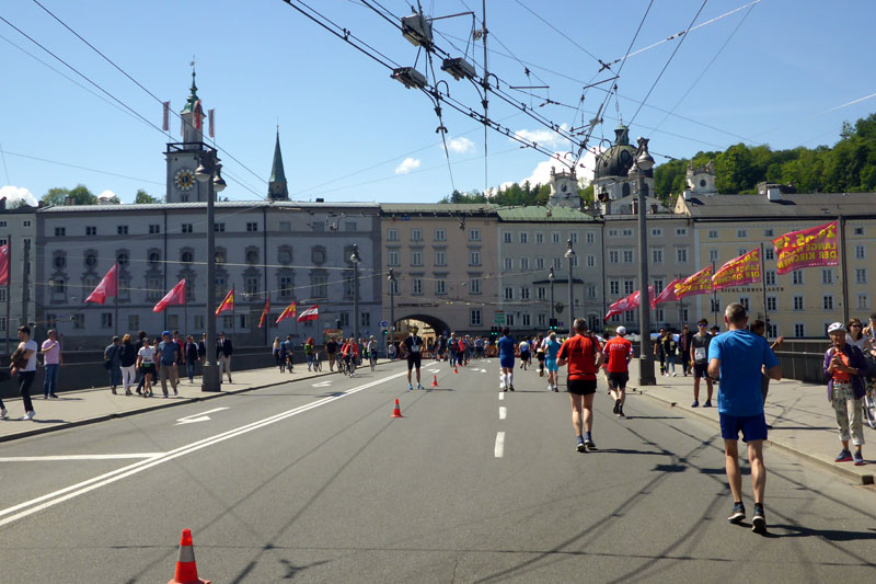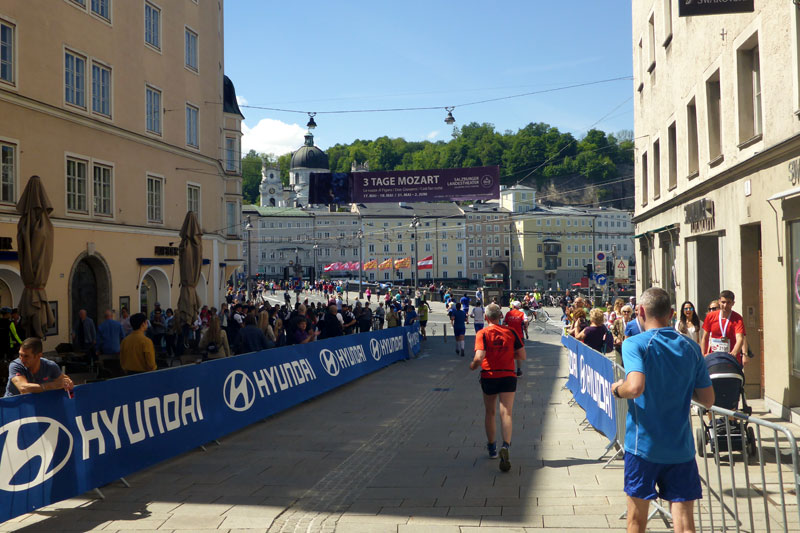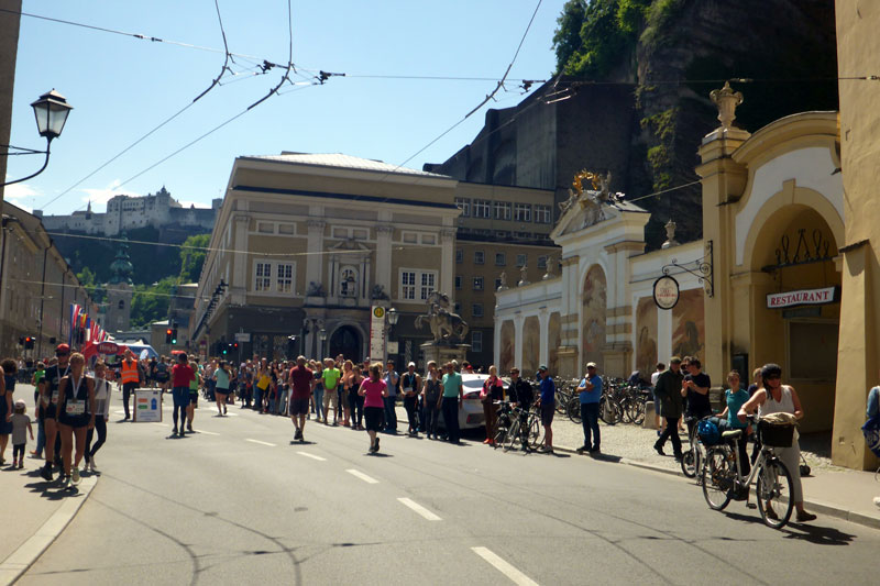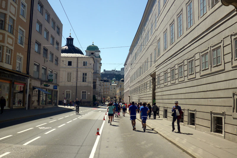 Am Sonntagmorgen stehe ich zeitig auf, gönne mir im Hotel ein gutes Frühstück und freue mich schon auf meinen Lauf durch Salzburg. Am Himmel ist keine Wolke zu sehen und es ist bereits angenehm warm. So nutze ich die drei Kilometer bis zum Startbereich am Ferdinand-Hanusch-Platz gleich mal, um mich etwas warmzulaufen und komme natürlich auch etwas zu früh an. Die verbleibende Zeit nutze ich noch für einen kleinen Spaziergang durch die Getreidegasse. So ruhig und entspannt wie um diese Uhrzeit kann man sonst kaum durch die historische Gasse schlendern. In der schmalen, gut 350 Meter langen Gasse haben sich zahlreiche Traditionsbetriebe und Souvenirgeschäfte angesiedelt. Noch heute zieren schmiedeeiserne Firmenschilder, die teilweise mehrere hundert Jahre alt sind, die Gebäude. Die Hausnummer 9 in der Getreidegasse ist wohl der Hauptanziehungspunkt der unzähligen, überwiegend asiatischen Touristen, die täglich durch die Gasse ziehen. Hier wurde 1756 Salzburgs bekanntester Sohn, Wolfgang Amadeus Mozart geboren. In Mozarts Geburtshaus, wie es in großen Lettern an der Häuserfront zu lesen ist, findet man heute eines von zwei Mozart-Museen in Salzburg.