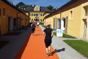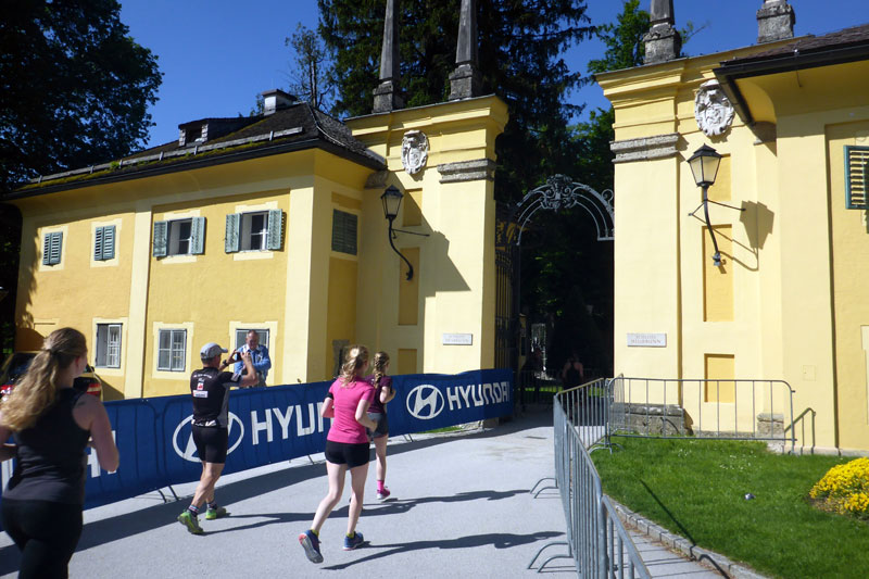 Am Ende der Allee erreichen wir das Schloss Hellbrunn selbst. Wir biegen nach rechts ab und laufen durch ein Tor auf einer langen Auffahrt direkt auf das Schloss zu. Der Kiesweg wurde extra für den Marathon mit einem orangen Teppich ausgelegt und sorgt für ein ganz besonderes Feeling. Das Schloss selbst entstand in einer rekordverdächtigen kurzen Bauzeit von 1612 bis 1615. Baumeister Santino Solari, der sich auch für den Salzburger Dom verantwortlich zeigte, schuf hier einen der prächtigsten Spätrenaissance-Bauten nördlich der Alpen. Das Lustschloss wurde durch Fürsterzbischof Sittikus zum Zweck der Lebenslust und Unterhaltung erbaut. Das Areal verfügt auch über Wasserspiele und großzügige Garten- und Parkanlagen. Auch der Salzburger Zoo ist heute auf dem Gelände der Hellbrunner Schlossanlage beheimatet.