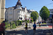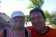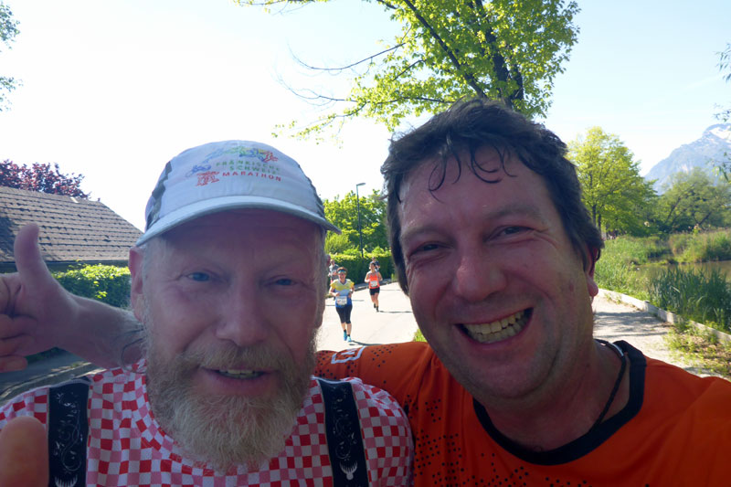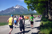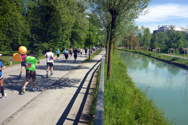 Ehe wir uns versehen, haben wir das Schloss auch schon wieder hinter uns gelassen und laufen kurze Zeit später auf der Keltenallee in Richtung Osten. Vor uns liegt wieder ein traumhaftes Panorama mit den schneebedeckten Salzburger Alpen. Für ein paar Kilometer gleicht der Salzburg Marathon nun einem Landschaftslauf. Die Temperaturen haben inzwischen sicherlich schon die zwanzig Gradmarke geknackt und ich freue mich über die schattenspenden Bäume. Auch wenn ich heute nur beim Halbmarathon unterwegs bin, merke ich schon jetzt, dass es dennoch anstrengend werden könnte. Für mich gleicht der Lauf heute einem langen Intervalltraining, da ich immer wieder zu Fotostopps anhalte und anschließend beschleunigt auf Jürgen auflaufe.