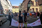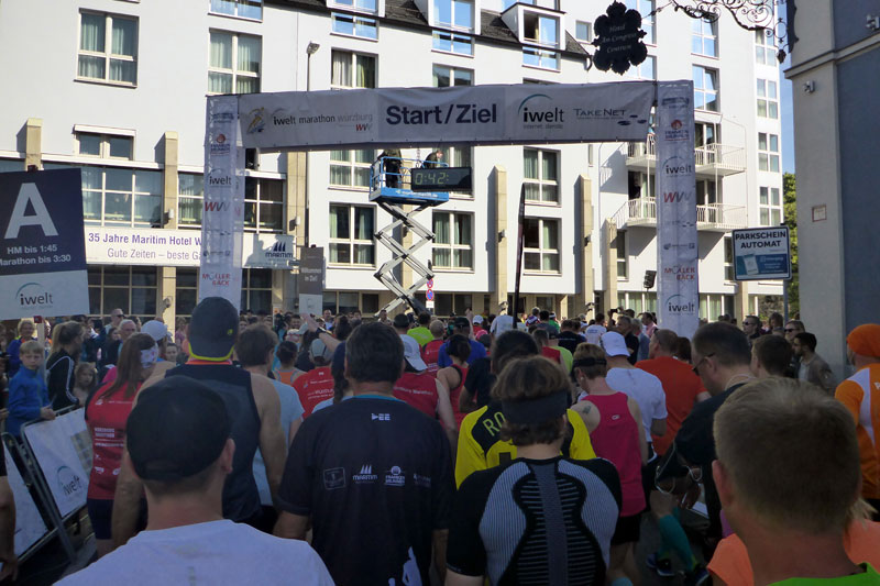 Gut 450 Marathonläufer und etwas über 1000 Halbmarathonis werden es am Ende sein, die Würzburg erlaufen wollen. Es wird in drei Startblocks gestartet und wir sortieren uns natürlich im letzten ein. Bis zum Zielschluss sind gut 5:30 Stunden Zeit und Bernie und ich haben uns entschlossen, diese heute auch nahezu auszureizen. Es soll ein gemütlicher langer Trainingslauf sein und wir wollen vor unserem Hundertsten beide nichts riskieren, zumal es heute ja mal wieder ziemlich warm werden soll. Etwa fünf Minuten vor dem Start entdecke ich ein paar Reihen vor mir noch den Pacer-Wimpel für zwei Stunden im Halbmarathon. Ich pflüge mich noch schnell durch das Feld der Wartenden und begrüße mit Bernadette eine liebe Bekannte. Viel Zeit bleibt uns nicht und ich bin rechtzeitig zurück bei Bernie. Mit einem lauten Knall wird der erste Startblock auf die Reise geschickt, schließlich der zweite und dann sind auch schon wir an der Reihe. Es geht los, der iWelt Marathon ist auch für uns gestartet.