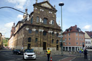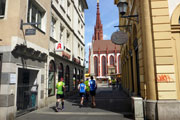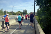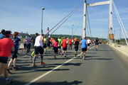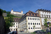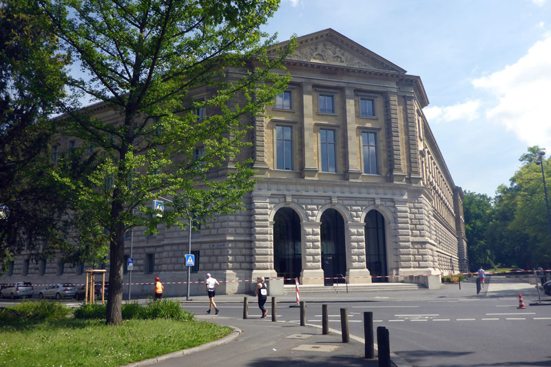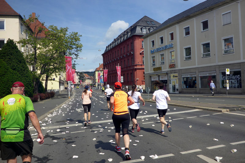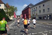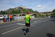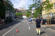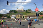 Wir schlängeln uns nun weiter durch den Ortsteil Zellerau, werden von DJ`s unterhalten und auch eine kurze Begegnungsstrecke sorgt für Laune. Etwa bei Kilometer 7 unterqueren wir die Friedensbrücke, die zweitnördlichste der sieben Würzburger Mainbrücken. Es handelt sich um eine Steinbogenbrücke mit einer Gesamtlänge von gut 200 Metern. Die sieben langgestreckten Bögen haben eine Spannweite von jeweils 24,5 Metern, die von sechs Pfeilern getragen werden. Unter der Brücke sorgen die Todoroki Wadaikos mit ihrer japanischen Trommelkunst für Unterhaltung und bieten eine gelungene Abwechslung zu den üblichen Samba-Trommlern. Beschwingt geht es für Bernie und mich weiter durch Würzburg und wir passieren die einzige Jugendherberge Würzburgs, die in einem schönen historischen Gebäude am Fred-Joseph-Platz untergebracht ist. Über ihr thront die Festung Marienberg, wohl das Wahrzeichen der Stadt Würzburg. Sie diente über Jahrhunderte als Herrschaftssitz der Würzburger Fürstbischöfe. Als ältester erhaltener Teil gilt die Marienkirche aus dem Jahr 706. Heute findet man in der Festung das Museum für Franken und ein Tageszentrum. Neben den Weinhängen findet man unterhalb der Festung auch den Park der Landesgartenschau von 1990. Ein Abstecher zur Festung würde mir schon gefallen, aber der muss heute leider ausbleiben, denn die zu überwindenden Höhenmeter passen eher zu einem Traillauf, als zu einem schnellen Stadtlauf.