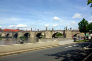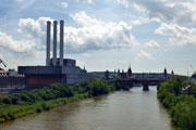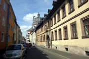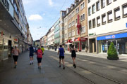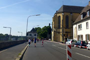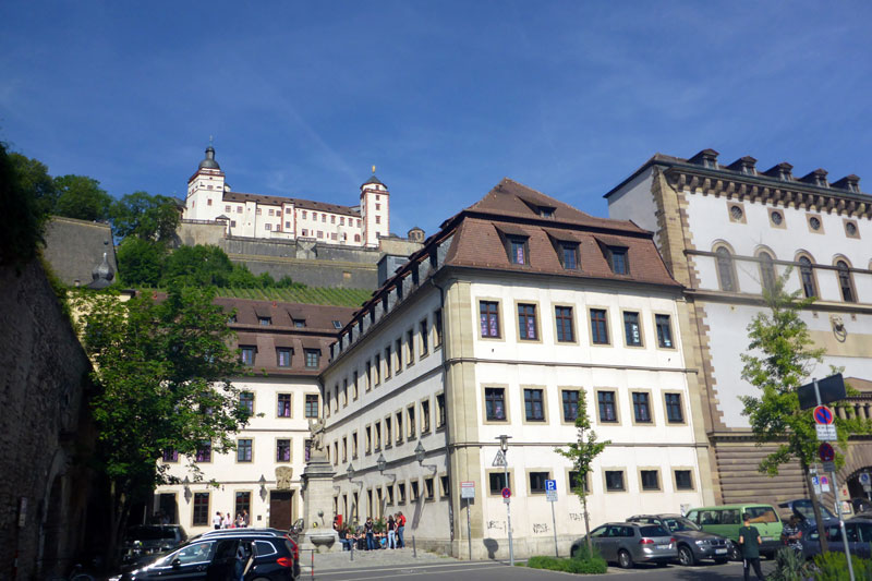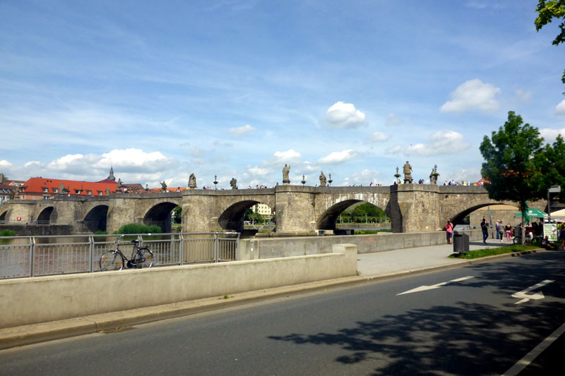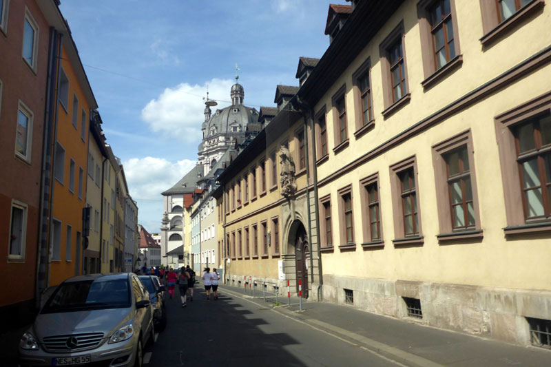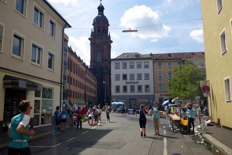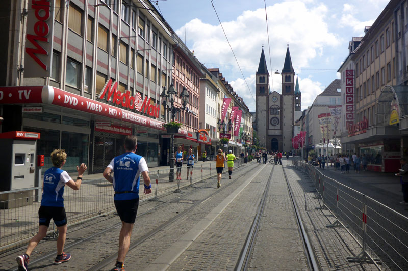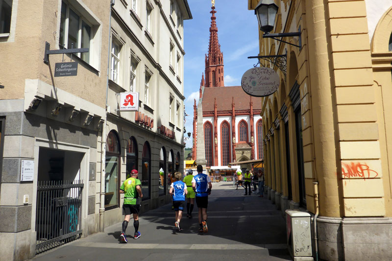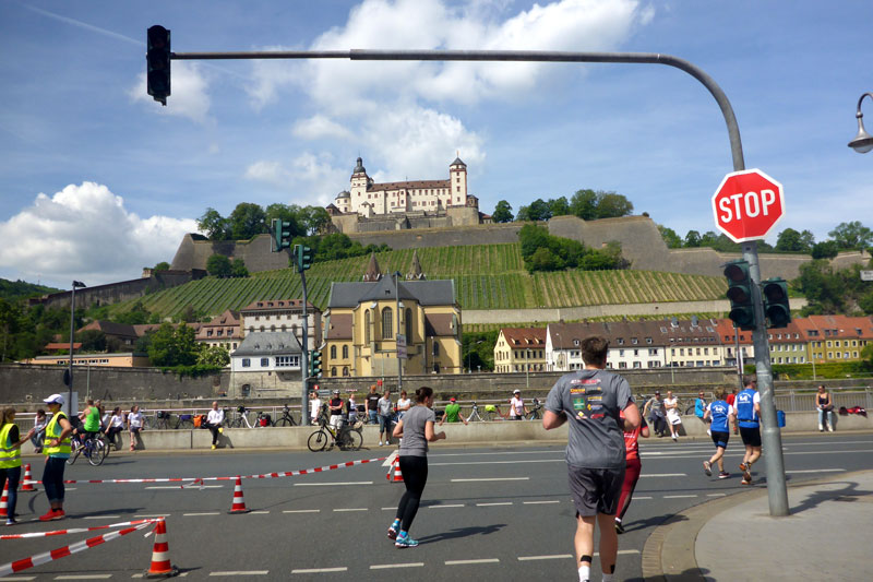 Über die Veitshöchheimer Straße geht es erst einmal in Richtung Norden auf die Brücke der Deutschen Einheit zu, die wir noch vor Erreichen des ersten Kilometers überqueren werden. Sie ist eine von sieben Brücken, die in Würzburg den Main überspannen. Die am nördlichsten gelegene Brücke führt uns vom Ortsteil Äußere Pleich nach Zellerau und überspannt auch den Alten Hafen, sowie die Mainwiesen am linken Flussufer. Die Brücke mit ihren drei Fahrspuren in beiden Richtungen ist entsprechend breit und so kann sich das Läuferfeld gut entzerren. Weiter geht es nun durch einige Wohn- und Industrieviertel. Hin und wieder lässt die Straßenführung einen Blick auf den Würzburger Stein zu. Die weltberühmte Lage des Würzburger Steins erstreckt sich nördlich der Würzburger Altstadt und ist mit 85 Hektar die größte zusammenhängende Weinlage Deutschlands. Durch die Geländebeschaffenheit, die Hangneigung und nicht zuletzt die Nähe zum Main bieten sich hier optimale Bedingungen für den Weinbau. Über den sogenannten Steinwein schrieb schon Goethe an seine Frau Christiane: „Kein Wein will mir schmecken und ich bin verdrießlich, wenn mir mein Lieblingsgetränk abgeht.“ Eine Flasche Wein hat sich Goethe allerdings entgehen lassen, denn der älteste noch trinkbare Wein ist ein Steinwein aus dem Jahre 1540, der im Würzburger Bürgerspital gelagert wird.