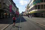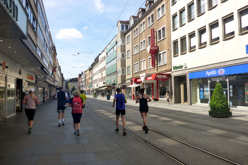 Weiter geht es in Richtung Süden, immer am Main entlang bis raus zur Konrad-Adenauer-Brücke, der südlichsten Brücke über den Main. Der Weg dorthin ist von Bäumen gesäumt und ich nehme deren Schatten gerne an. Die Temperaturen sind bei gut 25 Grad angelangt, es wird also richtig warm heute. Hinterhalb der Konrad-Adenauer-Brücke haben wir wieder eine Begegnungsstrecke vor uns. Ein äußerst gut gelaunter DJ macht auch hier Stimmung und motiviert die Läuferschar. Wir sind hier bei Kilometer 11 bzw. 12 angelangt. Wir wechseln nun von der linken auf die rechte Mainseite und machen uns zum ersten Mal auf den Rückweg in Richtung Würzburger Altstadt. Doch zuerst gilt es noch den Ortsteil Sanderau zu durchqueren. Auch hier geht es durch ein großes Wohnviertel, doch zahlreiche Zuschauer und DJ`s sorgen auch hier für eine riesen Stimmung.
