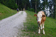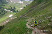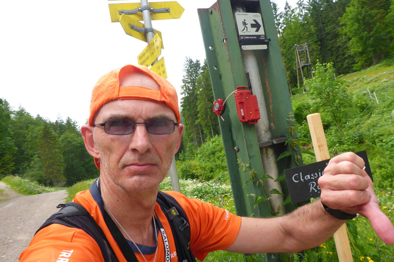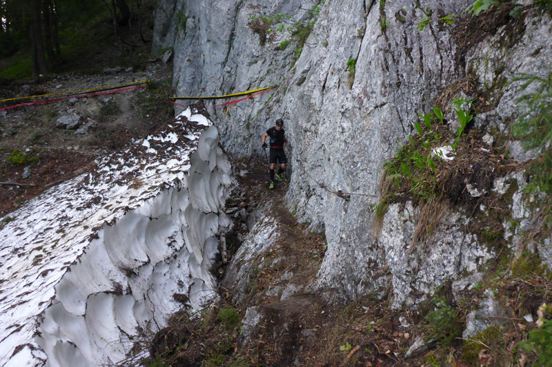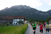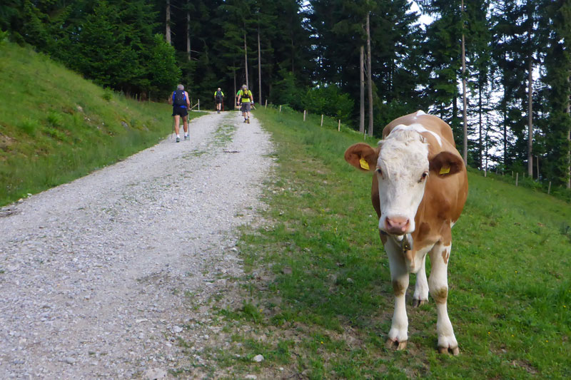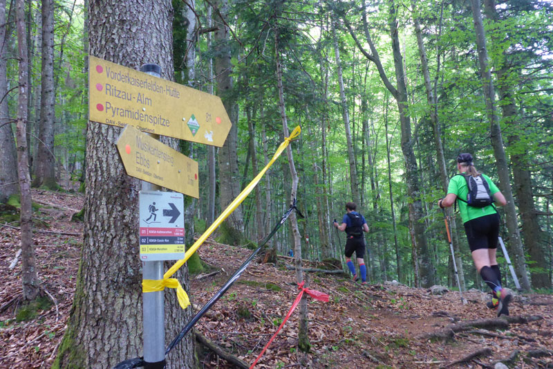 Die Kühe fühlen sich vielleicht etwas gestört von uns, schauen grimmig drein, sind aber friedlich und lassen uns passieren. Langsam nimmt die Steigung zu. Die erste Labestelle erreichen wir an der Aschinger Alm nach 7,5 km. Noch weht ein kühles Lüftchen, aber die Wolken haben sich schon fast verzogen. Ich gönne mir einige Becher Iso. Anschließend geht es noch einen Kilometer abwärts auf Asphalt und dann links weg in den Kaiserwald. Ich muss vorsichtig sein, seit einigen Wochen konnte ich wegen verhärteter Waden kein Lauftraining mehr absolvieren. Natürlich werde ich so von einigen geschluckt.