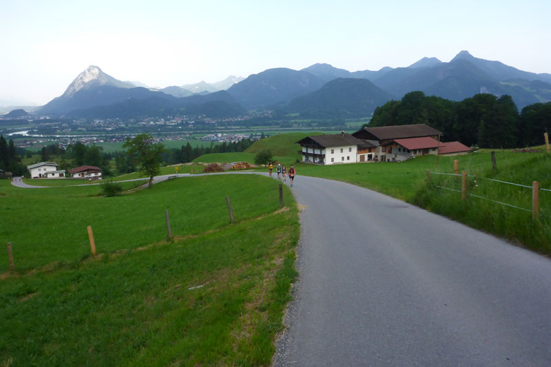 Der Start erfolgt pünktlich. In östlicher Richtung durchqueren wir erst einmal die Gemeinde. Ebbs ist mit einer Seehöhe von 475 m das tiefstgelegene Dorf Tirols, somit relativiert sich schon wieder unsere höchstgelegene Stelle von 1550 Metern, da geht’s ganz schön rauf. Die Nordwände des Zahmen Kaiser liegen in ihrer ganzen Dimension direkt vor unseren Augen, steil brechen sie in die breite Talebene herab. Bevor es aber da für uns richtig auffi geht, dauert es noch etwas. Wir ziehen vorerst noch mit mäßiger Steigung durchs Unterinntal. Einige Kilometer müssen wir uns gedulden bevor es runter von Asphalt- und Schotterstraßen auf die Trails geht.