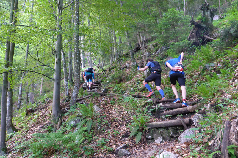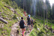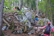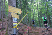 Nach 11 Kilometern erreichen wir den Einstieg in den Musikantensteig. Jetzt wird’s ernst. Die Strecke des Ultratrails vereint sich hier mit den Teilnehmern des Classic-Run, Halbmarathon, „40er“ Klassisch und „20er“, was gleich für deutlich mehr Belebung auf der Strecke sorgt. Vorerst sind es aber nur Wanderer. Der Start des Classic-Run erfolgt erst um 9 Uhr und die Halbmarathonis folgen um 11 Uhr.