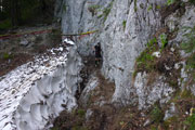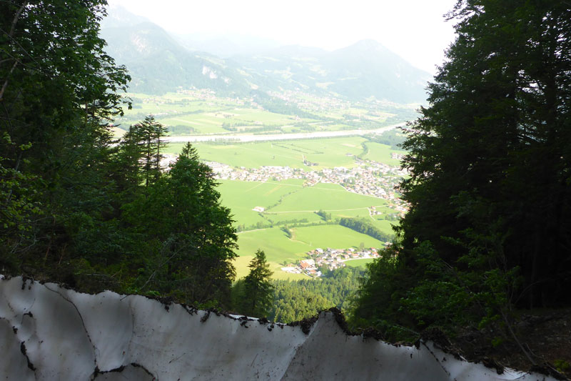 Etliche Stufen erleichtern uns den steilen Aufstieg. Vor einer seilversicherten, ganz schmalen Querung an einer Felswand entlang hat sich eine hohe Schneewechte aufgebaut. Ich hab sie noch gut in Erinnerung, normalerweise ist die steilabfallende Passage ziemlich spektakulär mit toller Aussicht ins Inntal. Die hochaufgetürmte Schneewand nimmt uns aber jeglichen Nervenkitzel. Macht dafür aber optisch wieder etwas gut.