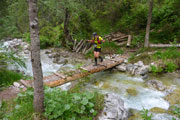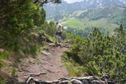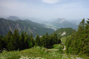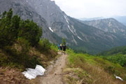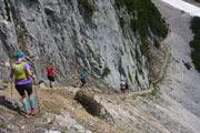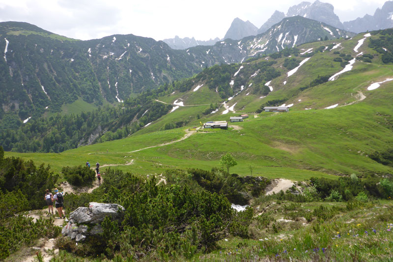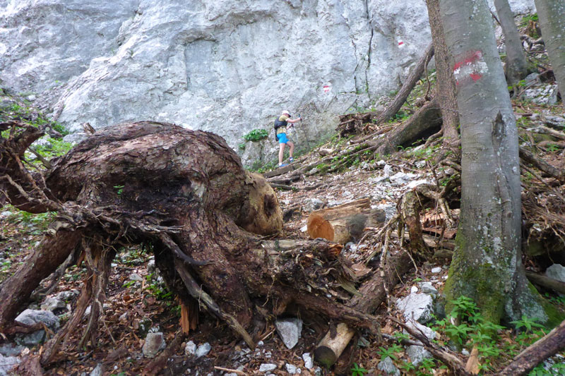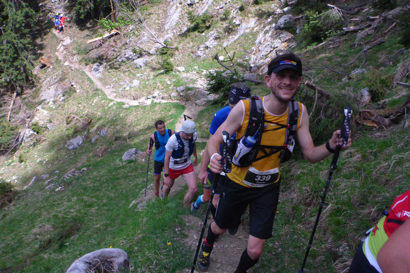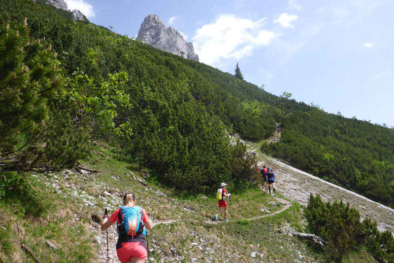 Wir erreichen den Ansatz der Felsenwände, die Steilheit nimmt nochmals zu, da sind schon mal 45% Steigung mit dabei. Immer wieder sind auch Stufen in den Pfad eingearbeitet, serpentinenförmig geht es hinauf. Wir verlassen den Wald und über uns kann man bereits die Vorderkaiserfeldenhütte ausmachen, wir erreichen sie nach 13,4 km. Auf 1400 Meter Höhe wird uns hier einer der schönsten Ausblicke ins Kaisertal geboten. Das hat natürlich schon seinen Preis, ich bin ziemlich fertig und nehme erst mal Platz vor der Hütte und verpflege mich ausgiebig an der Verpflegungsstation.