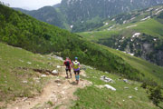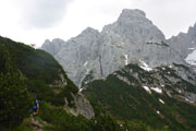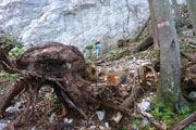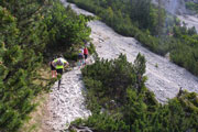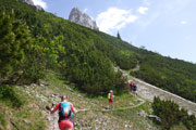Wenig später erreichen wir den Musikantentreff. In früheren Zeiten trafen sich hier die Musikanten um sich zum Musizieren in den Hütten im Kaisertal zu verabreden. In einem ausgehöhlten und vergitterten Felsen sind auch Musikinstrumente vergangener Zeit ausgestellt. Gerade hat sich eine große Gruppe hier eingefunden, aber nicht um zu musizieren, sondern um eine kurze Rast zu machen, von dem anstrengenden Aufstieg.