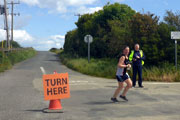 Dee überreicht mir nun auch meine Startnummer. Es ist die „100“. Wow, was für eine Ehre. Zudem hebt sich meine Startnummer auch farblich von den anderen ab. Natürlich machen wir noch ein gemeinsame Erinnerungsfotos, bevor mir Silke helfen muss die Startnummer ans Shirt zu heften. Die Finger sind doch etwas zu zittrig. Schon vor dem Start erkennen mehrere Teilnehmer den Grund für die besondere Startnummer und gratulieren schon mal vorab. Dann geht es aber endlich los. Dee`s Sohn Aidan übernimmt das Startprozedere und schickt uns auf die Reise. Kaum bin ich ein paar hundert Meter gelaufen, verfliegt auch schon die Nervosität und ein gutes Gefühl stellt sich ein. Ich sortiere mich knapp hinter dem 4:30-Stunden-Pacer ein und will ihn langsam davonziehen lassen. 2:20 Stunden habe ich mir für die erste Hälfte vorgenommen, um dann gemütlich zurücklaufen zu können. Unter fünf Stunden will ich trotz des fordernden Höhenprofils bei meinem Jubiläum dann doch bleiben.