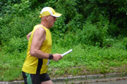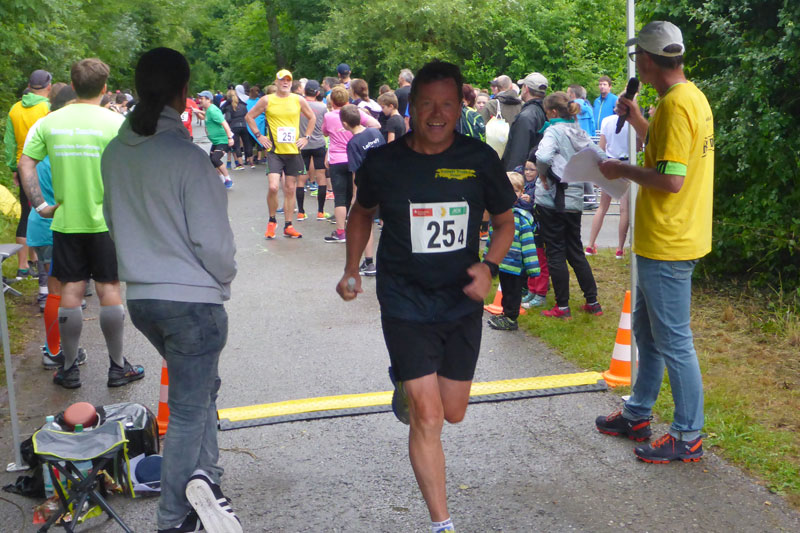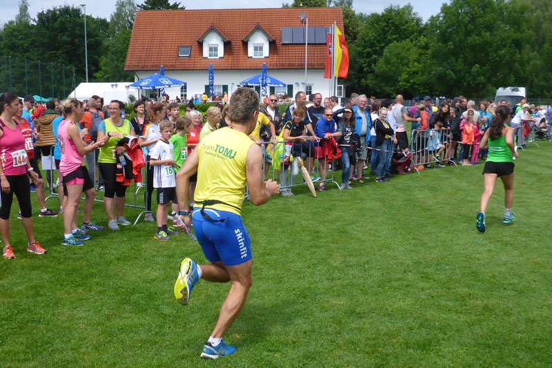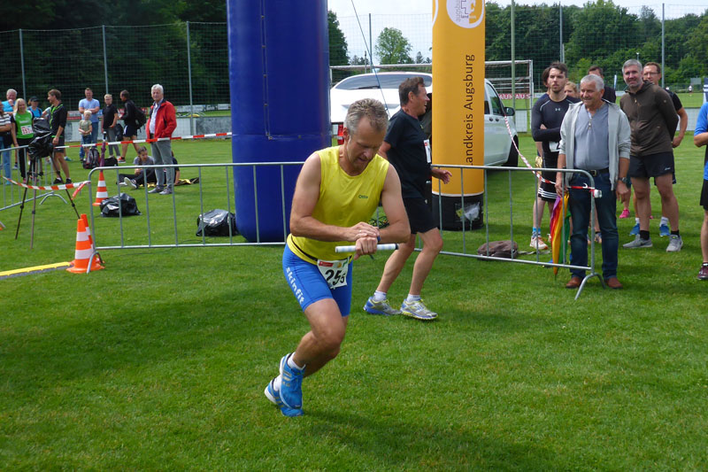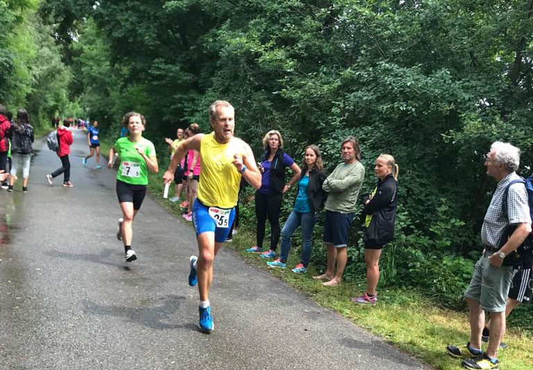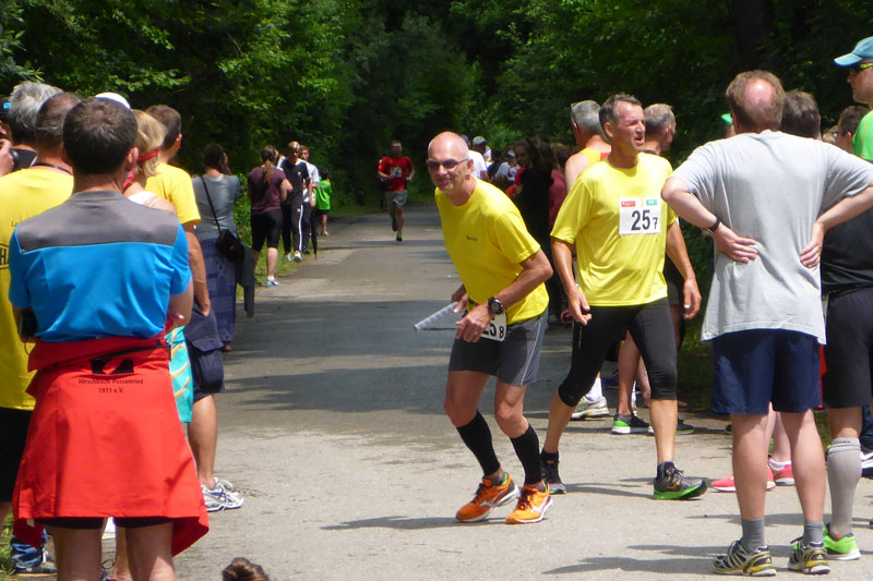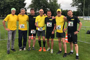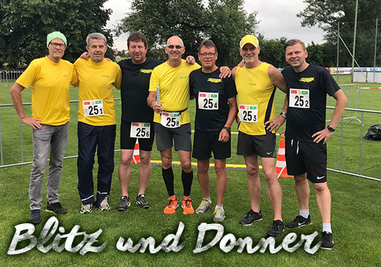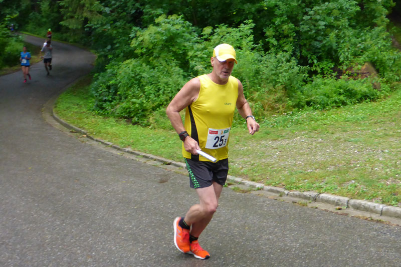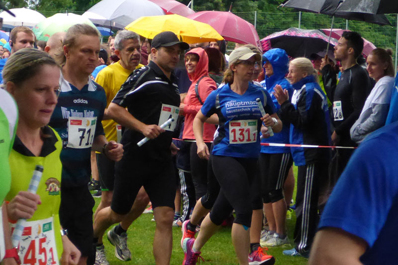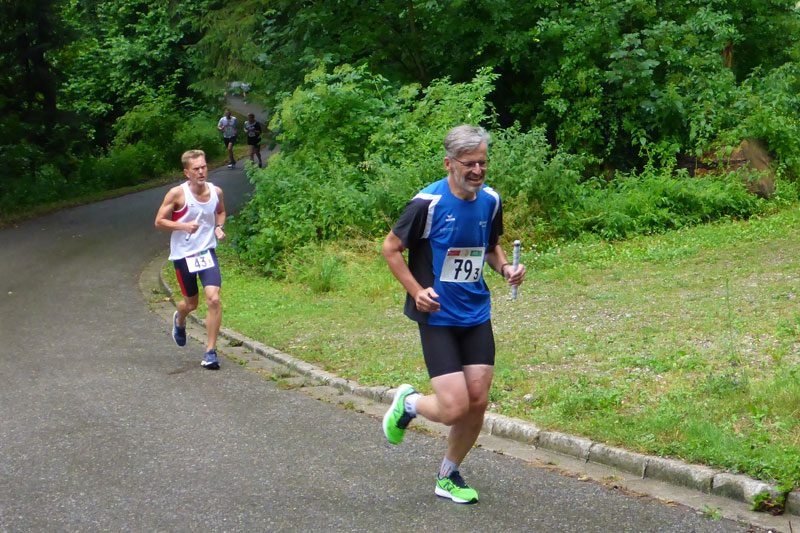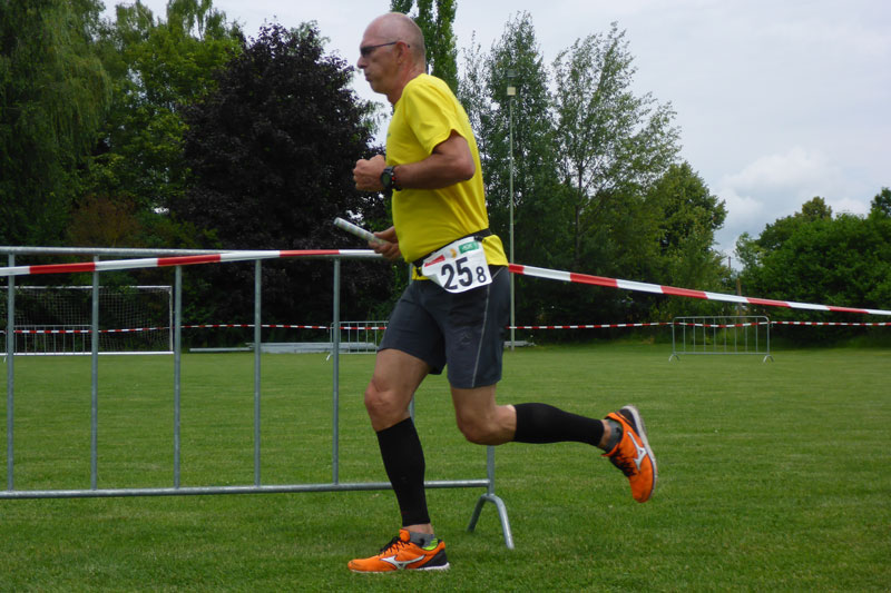 Als Startläufer ging Gerhard auf die deutlich anspruchsvollere Strecke 1 und übergab gut platziert auf Thomas, der noch kurzfristig für Otto eingesprungen war. Pech hatte Charly in der dritten Runde, er verpasste im Wald an einer Spitzkehre eine Abzweigung, wo sich vermutlich gerade ein Streckenposten wegen Regen eine Auszeit genommen hatte. Die Radlerin die ihm hinterher geschickt wurde, konnte die 1,7 Zusatzkilometer aber nicht mehr verhindern. Dieser Fauxpas kostete uns ca. 15 Plätze in der Endabrechnung. Peter folgte an vierter Stelle und wechselte auf unseren Gastläufer Klaus, der mit super Einsatz wieder einige Plätze gutmachen konnte. Greppi war gut drauf und konnte einen ordentlichen Schnitt laufen. Unser schnellster Mann war wie immer Hans, der wieder ein paar Positionen rausholen konnte. Bernie rettete als Schlussläufer noch einen 52. Platz über die Ziellinie.
