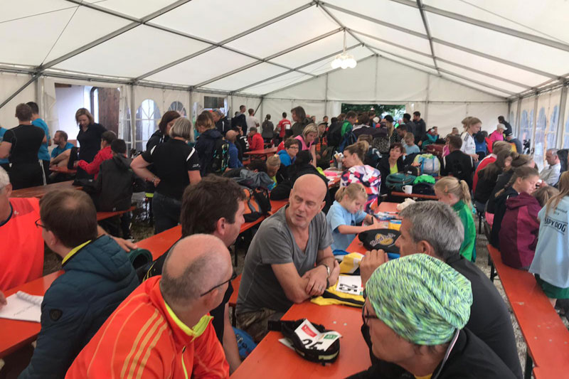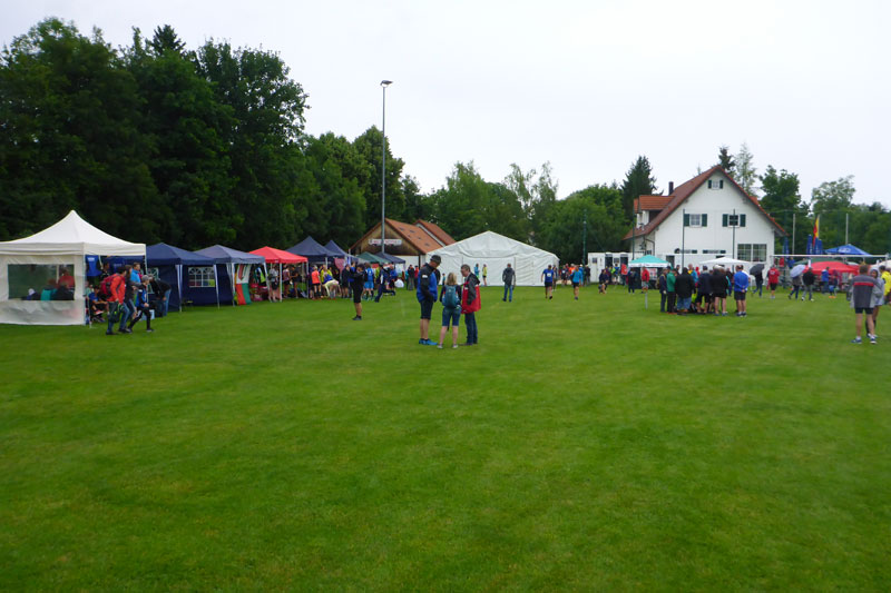 Glücklicherweise hatte der Ausrichter ein großes Zelt aufgestellt, wo wir unsere Klamotten deponieren und uns während der Regenschauer zurückziehen konnten. Kaum wurde der Beschluss verkündet, hörte es auch schon auf zu regnen. Wir nutzten die Zeit um ein Gruppenfoto zu organisieren, leider waren noch nicht alle vor Ort. Als dann mit genau einer Stunde Verspätung gestartet wurde, fing es wieder an zu regnen, allerdings ohne Gewitter. Im Laufe der Veranstaltung besserte sich das Wetter aber zunehmend, zur zweiten Hälfte wurde es sogar wieder richtig warm und die Sonne zeigte sich immer öfters.