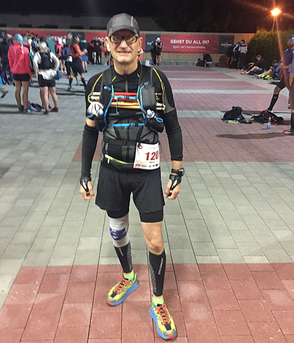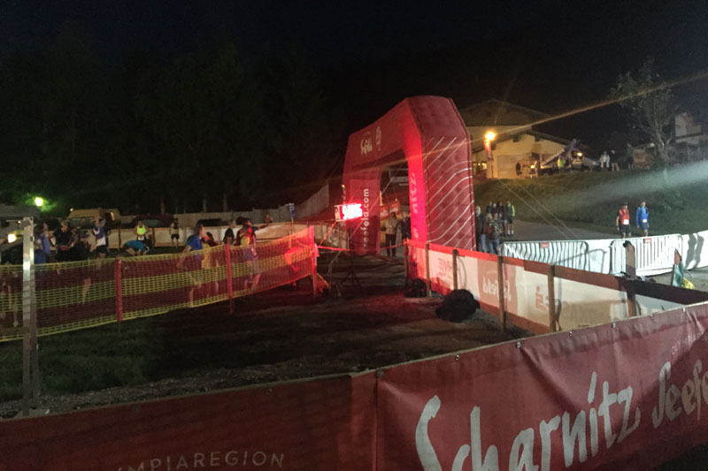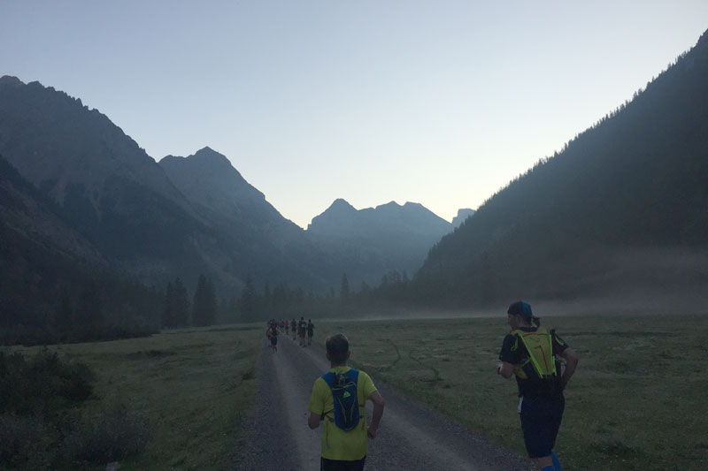 Ich holte meine Startunterlagen ab und dann kann die Frage, sollte ich mit meiner roten Läufernummer entsprechend der Klasse einsortieren oder doch lieber in der großen Masse der Wanderer einsortieren. Ich nahm die Gelegenheit wahr, mich mit meiner roten Nummer wesentlich weiter vorne einzusortieren, was für die ersten Kilometer doch Vorteile ergab. Aufs Wandern würde ich ja ohnehin frühzeitig umsteigen. So lief ich noch zum Start in der Dunkelheit los und das Ziel war zu joggen bis zur ersten Verpflegungsstelle dem Schafstallboden nach knapp 10 km. Auf dem Weg durch das Karwendeltal bis dorthin mussten auch 200 Hm bewältigt, die ging ich aber lieber um Kräfte zu sparen.