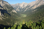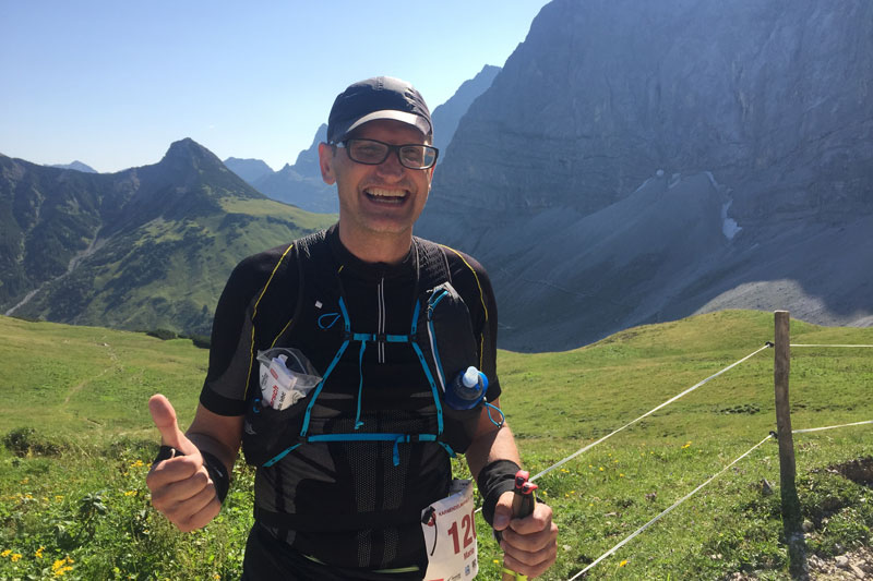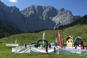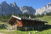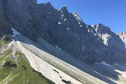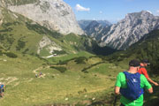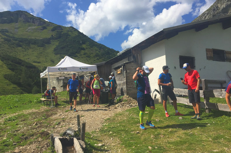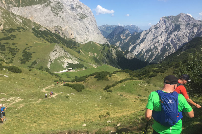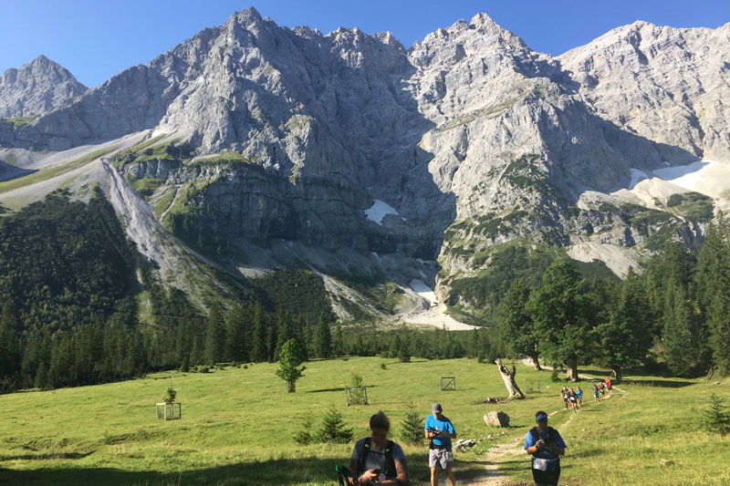 Anschließend ging es nur abwärts bis zum kleinen Ahornboden bei km 24, das ist eine sehr schöne Ebene, an der man am liebsten sitzen bleiben würde und auf die umliegenden Berge stundenlang schauen könnte. Da es mir immer noch gut ging, habe ich die Halte deutlich verkürzt und wollte schnell zur Falkenhütte bei km 30 kommen, die wegen Generalsanierung mit Neubau noch geschlossen ist. Ich kannte den weiteren Weg und wusste, dass es zäh wird. So war es auch dieses Jahr wieder, ich musste nach der bekannten Linksabbiegung auf dem Trampelpfad wieder einige Pausen einlegen und andere Teilnehmer vorbei ziehen lassen, da ich es trotz mehrmaligem Versuch einfach nicht durchgehend zügig wandern konnte. Macht aber nix, die Cut-Off Zeit in der Eng nach 8 ½ Stunden war nicht in Gefahr und so machte ich auch ein paar Bilder mit dem Handy.
