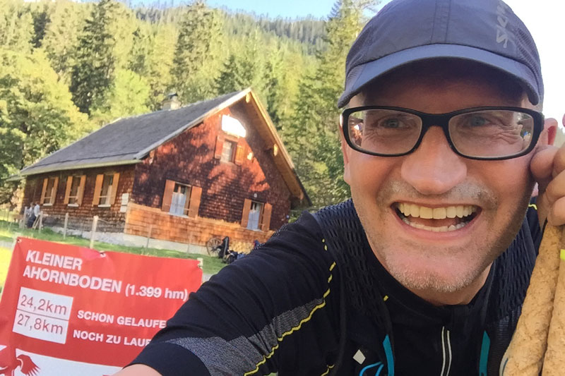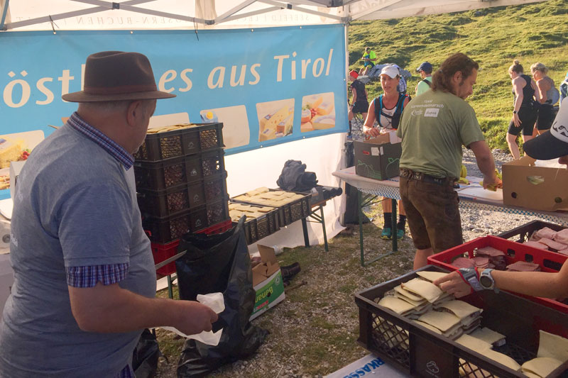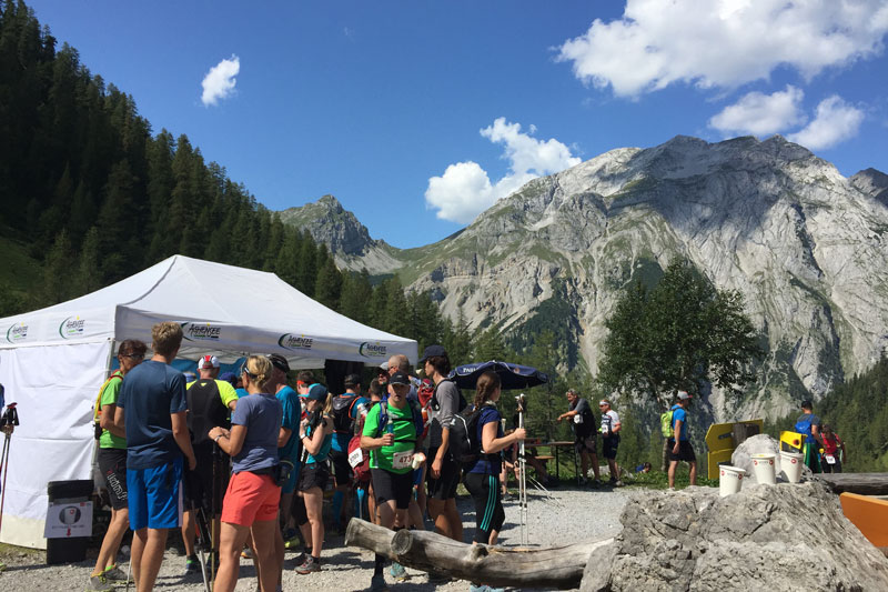 Bis zur nächsten Verpflegungsstelle nahe dem Karwendelhaus bei km 18 gab es noch ein kurzes laufbares Stück und dann ging es in schönen Kehren auf einem technisch einfachen Forstweg hoch, der einen schönen Ausblicke zurück ins Karwendeltal Richtung Scharnitz garantierte. Ich wunderte mich, dass es mir trotz dem Einlaufen noch relativ gut ging, ich wusste aber was noch kommt und daher machte ich mir keine Gedanken eine gute Laufzeit zu erreichen. Gedanklich war ich noch in der Wanderklasse, was auch völlig realistisch war. Am Karwendelhaus angekommen nahm ich zur Stärkung eine Kartoffelsuppe und griff zum Holundersaft, den ich sehr mag, dazu später mehr.