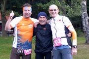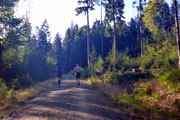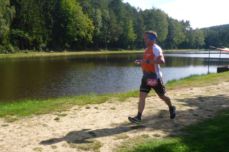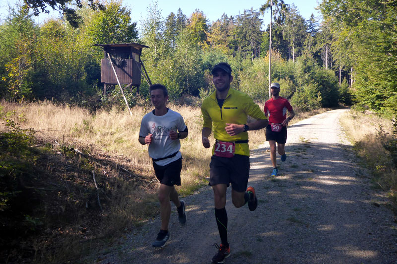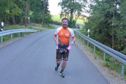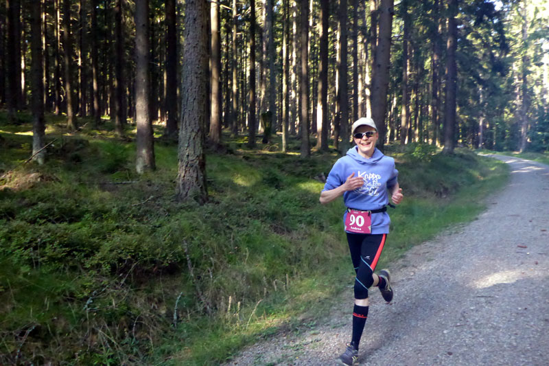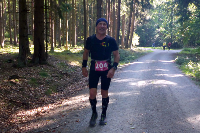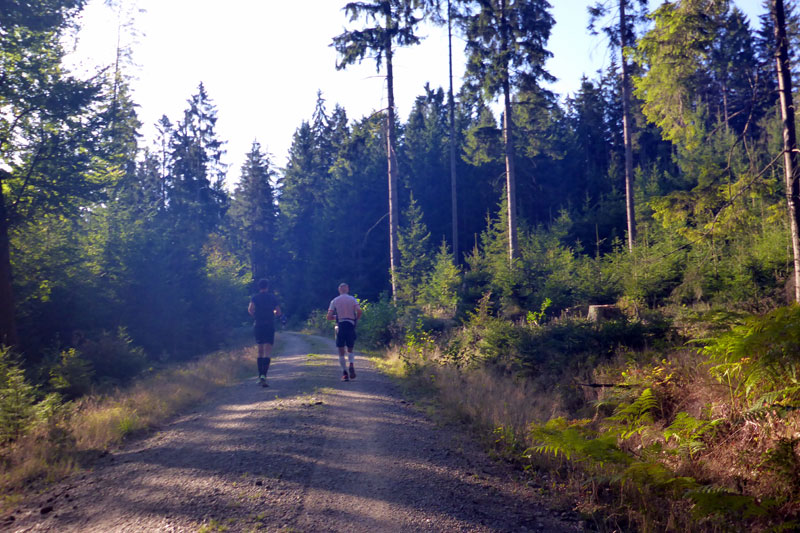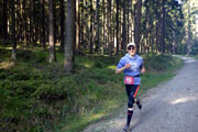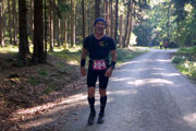 Die Strecke ist nun einfach zu beschreiben. Es geht einfach immer nur durch den Wald. Keine Sehenswürdigkeiten, keine Ortschaften, einfach nur Wald. Ich finde es herrlich. Vor mir kann ich lange Zeit noch Bernie und einen Mitläufer erkennen. Hinter mir weiß ich mit Jan noch zwei weitere Läufer. Aber ich bin alleine und das ist auch gut so. Immer wieder gibt es ein paar Anstiege zu bewältigen, die auch bald wieder mit Gefällen belohnt werden, auf denen man etwas Tempo machen kann. Nach vier Kilometern erreichen wir schon die erste Verpflegungsstation. Es gibt Wasser, Cola, Iso und Bananen, wie auch an den kommenden Stationen, so dass sicherlich für jeden etwas dabei ist. Die Helfer sind freundlich, motiviert und auch für den ein oder anderen Spaß zu haben. |