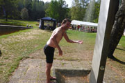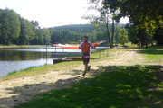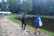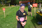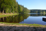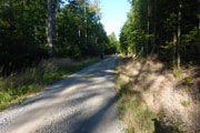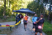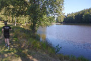 Außer dem Wald gibt es hier keine nennenswerten Aussichten oder landschaftliche Sehenswürdigkeiten zu bewundern, einfach nur Oberpfälzer Wald pur. Die einzigen, die für Abwechslung sorgen, sind die Viertelmarathonis, sie kommen uns entgegen. Später folgen dann noch die vor mir liegenden Marathonis. Nach gut 20,5 km sind wir wieder am Startplatz zurück. Den Abschluss bildet eine etwa 800 m langen Runde um den Bursweiher. Somit ist der Gesamtkurs etwas länger als die klassischen 42,195 Meter. Ich bin recht zufrieden, es läuft gut und in 2:15 Std. absolviere ich den ersten Abschnitt. Die Temperaturen sind jetzt mit etwa 15 Grad sehr angenehm, so lege ich meine Weste und Ärmel beim Zieldurchlauf ab.