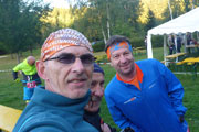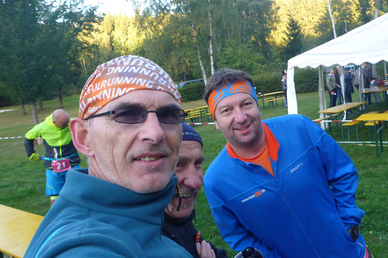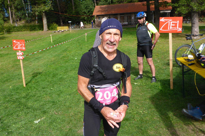Die zweite Runde beginnt gleich mit einigen strengeren Anstiegen. Janosch kommt mir nach etwa zwei Kilometern entgegen, Greppi habe ich verpasst, er war etwas hinter mir auf der Runde um das Naturfreibad, so sind wir uns nicht begegnet. Eigentlich wollte ich versuchen, alle Anstiege zu laufen, sie kosten aber doch zu viel Kraft, die ich mir für Heidelberg aufspare, sodass ich ein paar Walking-Einlagen vorziehe und damit meinen Schnitt nicht mehr ganz halten kann. Nach 4:49 h komme ich ins Ziel und bin voll zufrieden. Das passt. Mein Ziel waren die Sub 5.