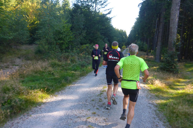 Der Böllerschütze hat nur eine Viertel Ladung ins seinem Abschussgerät, das geht fast etwas unter. Trotzdem starten alle pünktlich. Nach zwei Kilometern Landstraße geht es für uns rechts ab und wir verschwinden für den Rest im Oberpfälzer Wald, wo es sich auf den nachfolgenden 5 km bereits kontinuierlich nach oben zieht, über 150 Höhenmeter beinhaltet der erste Anstieg gleich zu Beginn. Die Steigung ist mäßig, aber über die Länge spürt man das dann schon in den Beinen, so dass bereits einige in den Wanderschritt verfallen. Die ersten beiden, der eine halbe Stunde nach uns gestarteten Halbmarathonläufer überholen mich nach 1 Stunde 15 Minuten. Nach 14 km geht es für uns abschnittsweise auf Langlaufrouten, die hier im Winter regelmäßig gespurt werden.