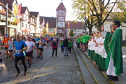 Der Countdown wird runtergezählt und los geht’s. An vielen jubelnden Zuschauern vorbei machen wir uns auf den Weg. Nach der Zielgeraden und vorbei an der Grundschule biegen wir nach rechts ab in den historischen Stadtkern. Vorbei am Rathaus laufen wir auf das Mühlentor zu, das noch als einziges von vier Stadttoren der früheren Stadtmauer erhalten ist. Erbaut vermutlich um 1200 rum, brannte mal ab, wurde wiederaufgebaut und seitdem mehrmals umgebaut und renoviert. Jetzt ein richtiges Schmuckstück. Kurz vorher biegen wir nach links ab und holen uns Gottes Segen ab. Den bekommen wir vom Pfarrer erteilt der samt seiner Ministranten am Portal der Stadtkirche „Unsere Liebe Frau vom Berge Karmel“ steht.
