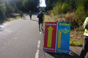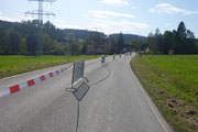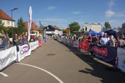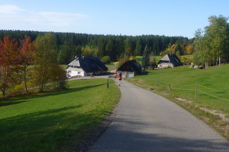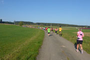 Ein schmales Sträßchen führt uns aus dem Ort, alles noch schön flach. Ungeschützt in der Sonne wird mir hier bereits richtig warm und das nimmt nach drei Kilometer noch zu, wir wechseln die Richtung und nehmen den Black Forest ins Visier der noch in einiger Entfernung liegt. Die Richtungsänderung bedingt aber auch ein spürbares Ansteigen des Kurses. Zwischen hier und Oberbränd bei km 17 liegen 300 Meter Höhendifferenz. Insgesamt sind auf unserer kompletten Runde fast 500 Höhenmeter zu bewältigen. Der Großteil davon auf der ersten Hälfte. Beim Rückweg geht‘s dafür meist leicht bergab.
