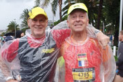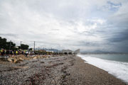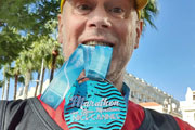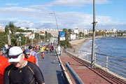 Bei km 30 sind wir wieder an der Küste. Nur einen knappen Kilometer weiter kommen wir am Kiefernwald Juan-les-Pins vorbei, wo jedes Jahr das berühmte Festival de Jazz d'Antibes Juan-les-Pins stattfindet. An der Südspitze von Cannes sehen wir die Lerins Inseln. Wir laufen immer am Meer entlang auf die Inseln zu und sind bald am Stadtrand. Bei km 40 sehen wir das Palm Beach Casino. Es geht um die Südspitze herum auf die weltberühmte Flaniermeile Boulevard de la Croisette zu, von hier ist es nicht mehr weit bis zum Ziel. Die Palmenallee führt uns direkt dorthin. Die letzten Meter, wir sehen das 1912 erbaute Carlton, dann das Ziel. Auf einem der schönsten Boulevards der Welt wird mir bei jetzt strahlendem Sonnenschein die Medaille umgehängt. |