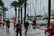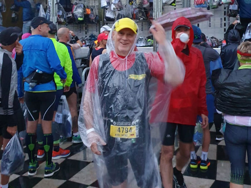 Um 8 Uhr soll es losgehen, leider haben wir einen der seltenen Regentage erwischt, wegen Unwetter wird der Start verschoben. Mein Regencape hält mich einigermaßen trocken. Mit 30 Minuten Verspätung geht es los. Pünktlich zum Start zieht ein heftiges Gewitter auf mit Starkregen, wie man ihn bei uns zu Hause nicht kennt. Innerhalb von 15 Sekunden bin ich bis zur Unterwäsche durchnässt. Den Regenumhang habe ich „glücklicherweise“ beim Startschuss bereits entsorgt.