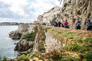 Nach verlassen des Ortes ziehen wir zur Landseite an einem großen und breiten Grüngürtel vorbei. Die Hälfte ist geschafft. Zwei Kilometer weiter erreichen wir Antibes. Das alte Stadttor führt uns in die Altstadt. Es geht steil bergauf bis auf die Festungsmauer. Hier haben wir einen herrlichen Blick auf das Meer, den Hafen und das Fort Carre. Auch das Wetter wird immer besser und mehr und mehr kommt die Sonne durch.