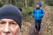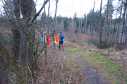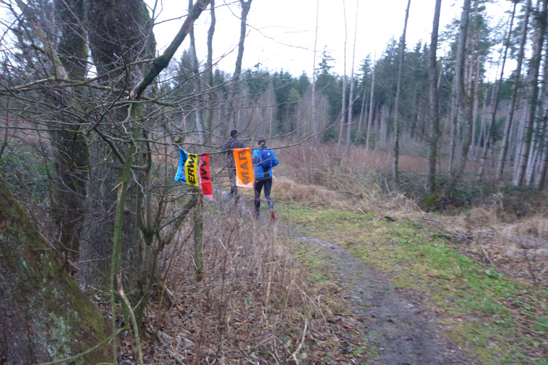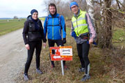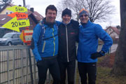 Wir erreichen bald Althegnenberg und damit die nächste Kontrollstelle. Neben dem Stempel holen wir uns auch einen Becher Tee und laufen weiter an der Bahnlinie entlang in Richtung Haspelmoor. Schließlich biegen wir nach rechts in den Wald und laufen eigentlich den schönsten Teil der Strecke. Ein wunderbarer Trail schlängelt sich durch den Wald und wir haben jede Menge Spaß. Das gemeinsame Tempo fühlt sich gut an und ich kann locker mit Bernie und Charly mithalten. Aber irgendwann erreichen wir dann doch Kilometer 12 und ein farbenfrohes Schild weist uns darauf hin, dass wir uns nun verabschieden müssen. Nur noch ein kurzes gemeinsames Selfie und dann heißt es für mich die kommenden 30 Kilometer allein unter die Füße zu nehmen.