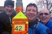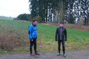 Als Charly vorfährt und ich einsteige, fällt mir sofort auf, dass Jan nicht an Bord ist. Jan hat Arbeit und fällt damit aus. Charly erklärt, dass er heute nur den Halbmarathon laufen wird. Charly hat Rücken. Auch Bernie will nur den Halben laufen. Bernie hat eine Erkältung. Kurz zögere ich. Ich entscheide mich aber dann doch dafür den Marathon zu laufen. Darauf bin ich eingestellt und hab mir heute auch nichts anderes vorgenommen. Es bleibt nicht viel Zeit, um uns zu unterhalten, denn keine viertel Stunde später parken wir auch schon in Hattenhofen ein und begeben uns in die Sporthalle, um uns dort anzumelden. Wir studieren noch kurz den Streckenplan, denn auch heuer gibt es wieder eine neue Strecke. Die ersten 12 Kilometer können wir gemeinsam laufen, bevor sich die Halbmarathon- und Marathonstrecke trennt. Da Bernie und Charly nur einen lockeren Trainingslauf machen wollen, will ich versuchen mit ihnen bis zur Streckenteilung gemeinsam zu laufen.