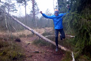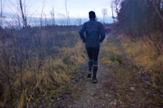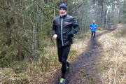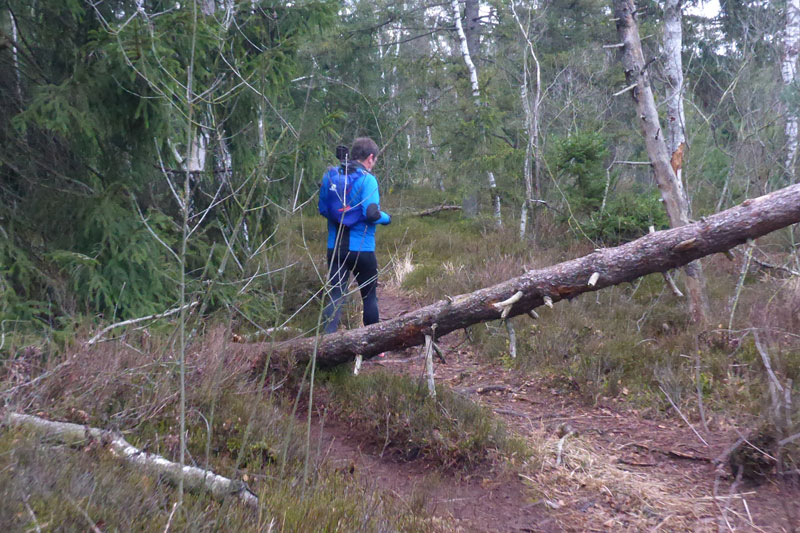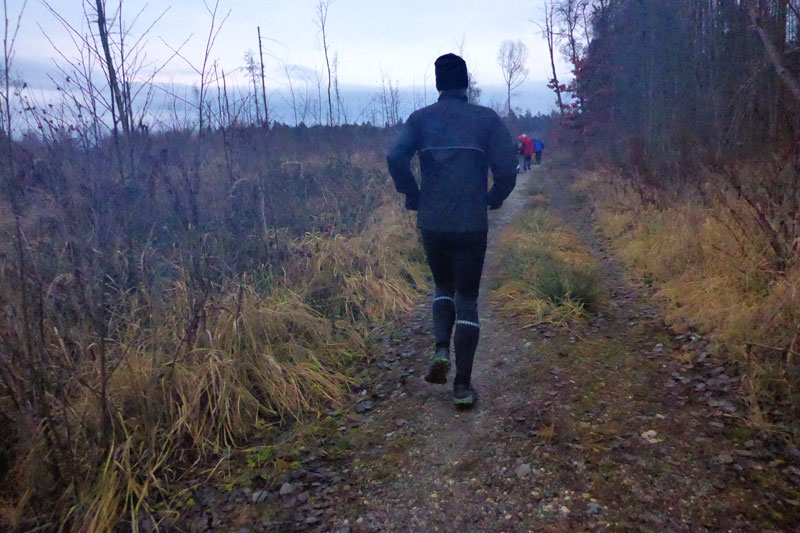 Nach einem gemeinsamen Foto geht es um kurz vor 8 Uhr also los. Wir traben gemeinsam los und sind schon mal verwundert, dass wir heute in die entgegengesetzte Richtung laufen dürfen. Die neue Strecke macht sich also schon auf den ersten Metern bemerkbar. Nur ein paar hundert Meter laufen wir durch Hattenhofen und schon finden wir uns auf einem Feldweg wieder. Nur etwas über zwei Kilometer müssen wir laufen, bis wir die erste Kontrollstelle erreichen. Wir sind beim „Fuchs“, wie wir diese Kontrollstelle getauft haben. In der Hütte hat uns schon bei unserer ersten Teilnahme ein ausgestopfter Fuchs mit Trachtenhut amüsiert. Wir holen uns den ersten Stempel auf unserer Kontrollkarte ab und weiter geht`s ins Moor. Leider nicht an der schönsten Strecke, aber dennoch mit sehr viel Natur um uns herum. Die Stimmung bei uns ist gut und schon bald haben wir die Orientierung verloren. Die Strecke ist aber perfekt ausgeschildert und es gibt keinerlei Probleme den richtigen Weg zu finden.