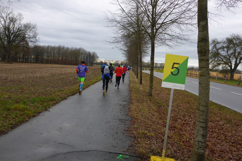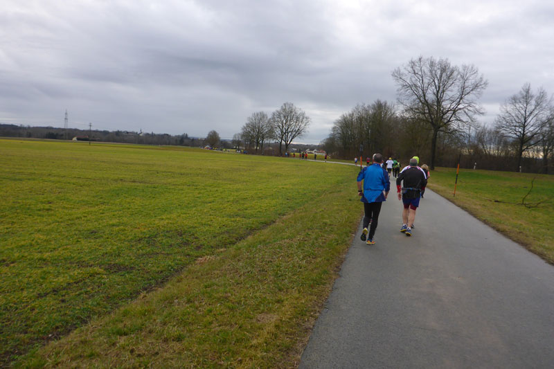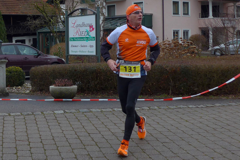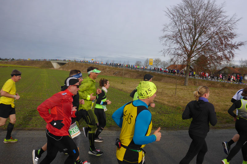 Nach 11 Kilometern durchlaufe ich zum ersten Mal die Zeitmessmatte am Ziel nach 1:08 Stunden, das liegt so ziemlich genau in meinem Plan. Die zweite Schleife ist mit 10 km etwas kürzer, für mich auch die Attraktivere. Man kann sich die so ergebenden 21,1 Kilometer als eine „8“ vorstellen, wobei sich die beiden Runden in der Mitte im Ortsteil Safferstetten überschneiden und man a bisserl aufpassen sollte, um nicht in die falsche Richtung abzubiegen. Nicht unbedingt in den ersten beiden Durchläufen, da ist das Feld noch eng beisammen, aber wenn nur mehr die Marathonis unterwegs sind, passen die Helfer nicht mehr so auf. Soll tatsächlich schon passiert sein. Die beiden Schlusskilometer einer jeden Runde sind identisch, so kann es auf dem Abschnitt noch vorkommen, von deutlich Schnelleren überrundet zu werden, bevor wir am Johannesbad wieder bei Start und Ziel durchkommen. So überholt mich der Führende des Halbmarathon bereits nach 10 km. Leider fängt es zu Mitte der zweiten Runde leicht zu regnen an, was das Wohlbefinden doch etwas stört.