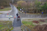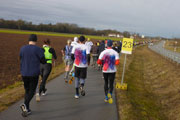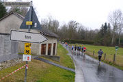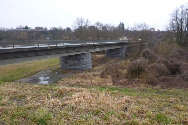 Bei km 18 führt uns der Kurs direkt an den Inn und somit auch an den Grenzübergang ins österreichische Obernberg. Nur noch der Damm und die Innbrücke trennen uns von einem Grenzübertritt. Von der Laufstrecke ist die Brücke aber leider nicht einzusehen, da uns der hohe Damm davon trennt. Ich beschließe einen kleinen Ausflug auf den Inn-Damm vorzunehmen. Von der Aussicht hab ich mir aber etwas mehr erhofft, der Inn ist auf der Dammkrone immer noch etwa 100 Meter entfernt, nur der Anfang der Brücke ist einzusehen. Das war wohl nix.