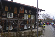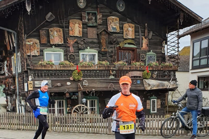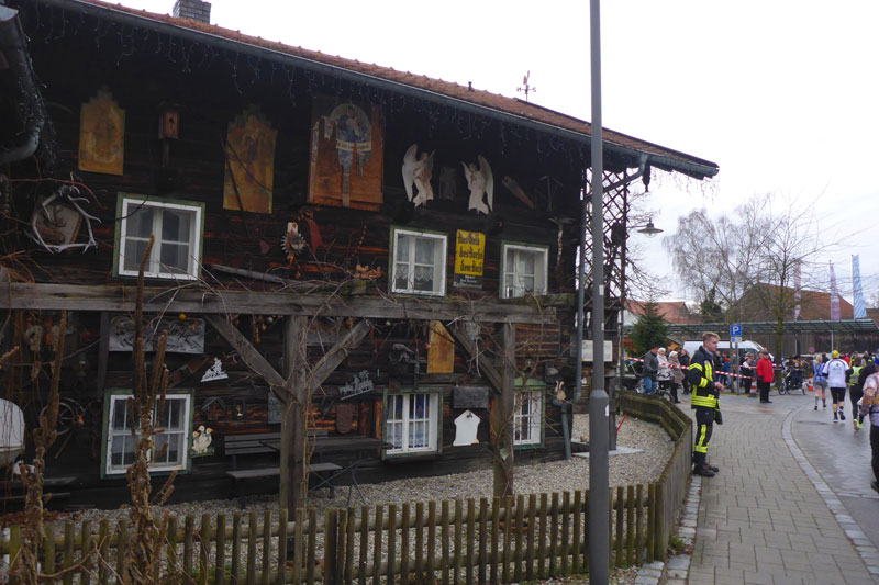 Nach 2:12 Stunden beende ich meine zweite Runde. So hab ich mir das vorgestellt um am Ende auf etwa 4:30 h zu kommen. Mehr ist mit sechs Wochen Training mit einigen gesundheitlichen Problemen für mich nicht drin. Schon geht’s auf die Dritte. Wieder geht‘s am markanten alten Holzhaus, jetzt vollgeplastert mit Antiquitäten und religiösen Reliquien in Safferstetten vorbei. Übernachtung 1,50 Reichsmark kann ich auf einem Schild lesen. Hier kann man sich gut vorstellen, wie es wohl vor 1938 ausgesehen haben muss, als die wenigen Bewohner vom Ackerbau lebten und bei einer Probe-Bohrung statt Öl warmes Wasser aus der Erde sprudelte. Was seiner Zeit aber niemanden wirklich interessierte.