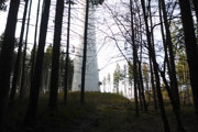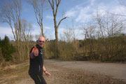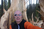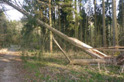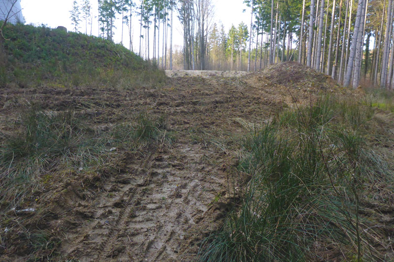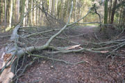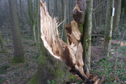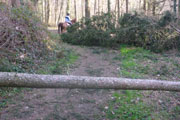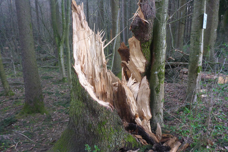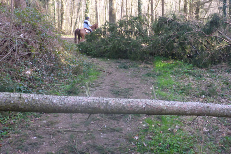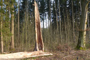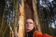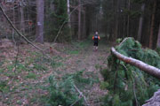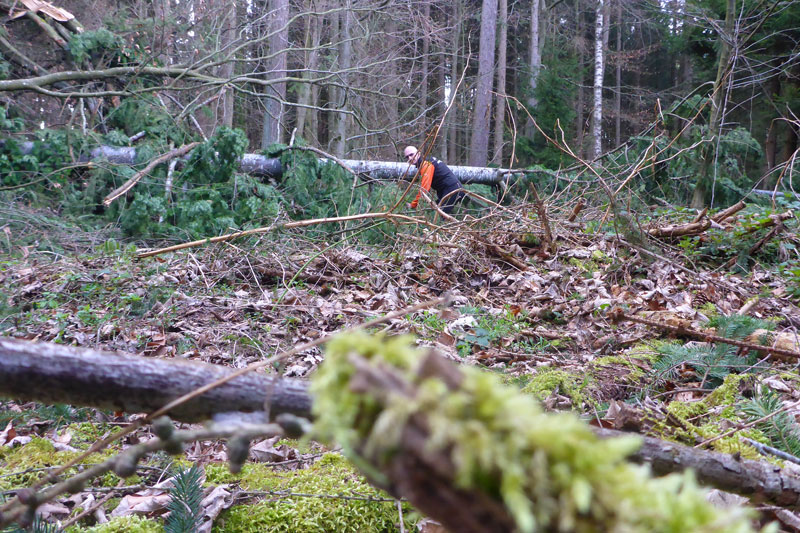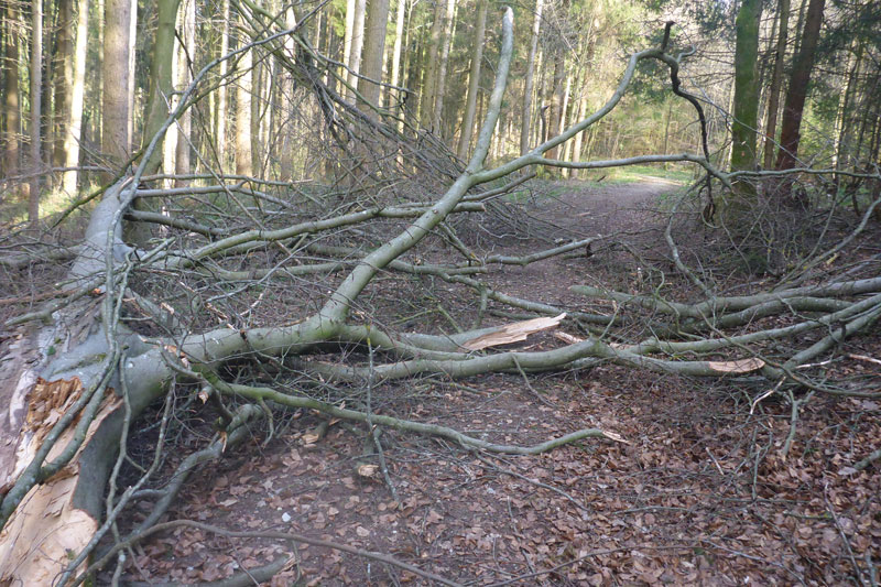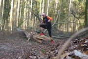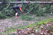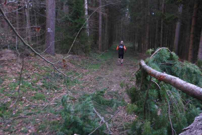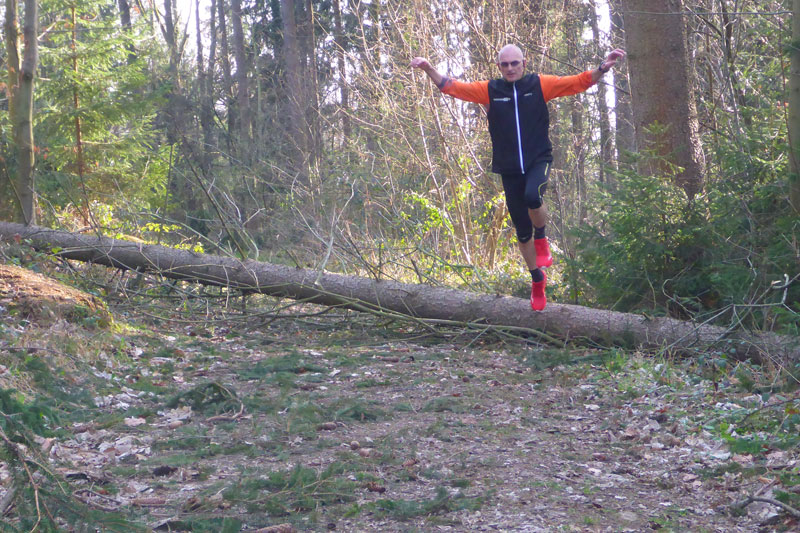 Nach den ersten Anstiegen bin ich mitten im Wald. Gewaltige Sturmschäden durch Sabine, Ute, Victoria und wie sie alle hießen die Sturmtiefs, die beinahe in Tagesabständen im Januar und Februar über unser Land zogen, werden mir erst heute so richtig vor Augen geführt. Aber, man kann dem ganzen natürlich auch etwas Positives abgewinnen, im Prinzip ist hier ein riesiger Abenteuer-Spielplatz für Trailrunner entstanden. Riesige Fichten liegen gefällt über meinen Trails, die von mir mehrmals Klettereinheiten fordern. Teils sind ganz bizarre Kunstwerke, aus den Resten der noch stehenden Stämme entstanden. Schön anzusehen, aber natürlich auch traurig. Meine Kamera ist heute ausnahmsweise auch einmal bei einem Trainingslauf am Mann, so nehme ich per Selbstauslöser einige Aktionen auf. Macht wirklich Spaß, kann ich euch ans Herz legen und nebenbei sieht man auch, welchen Aufwand man als Fotoreporter alles so auf sich nehmen kann. Selbstverständlich bin ich ganz alleine unterwegs, wie’s uns in den heutigen Tagen auferlegt ist. Reiter nutzen die gefällten Bäume auch für kleinere Sprungübungen, kann ich beobachten.
