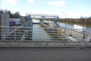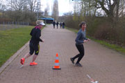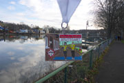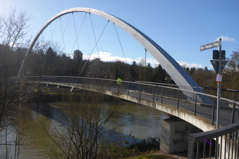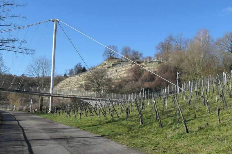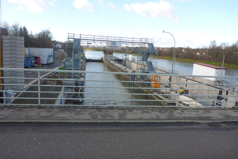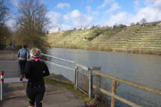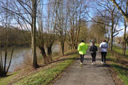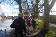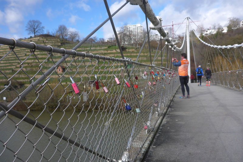 Mit Rückenwind erreichen wir nach 5 Kilometern die Schleuße Aldingen. Der erste Verpflegungsstand am Ende der Brücke bietet uns die Möglichkeit eines zweiten Frühstücks. Auf der gegenüberliegenden Neckarseite geht es auf dem Neckartal-Radweg wieder zurück bis zum Vier-Burgen-Steg (km 9), wo wir wieder auf die andere Flussseite wechseln und wenig später auch die erste Hälfte von Runde 1 an Start- und Ziel beenden. Greppi und Kati schließen wieder auf, nachdem sie anfangs etwas getrödelt haben. Charly hat sich nach vorne abgesetzt.