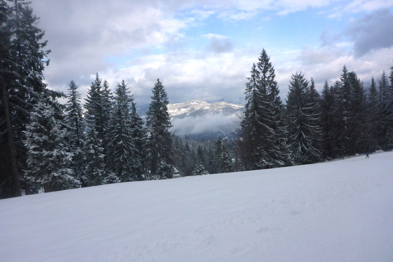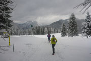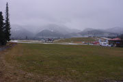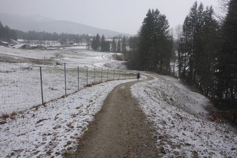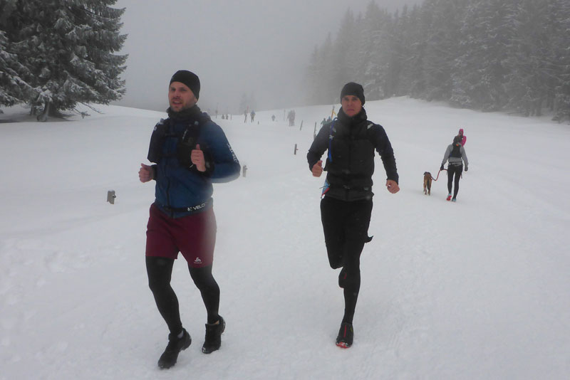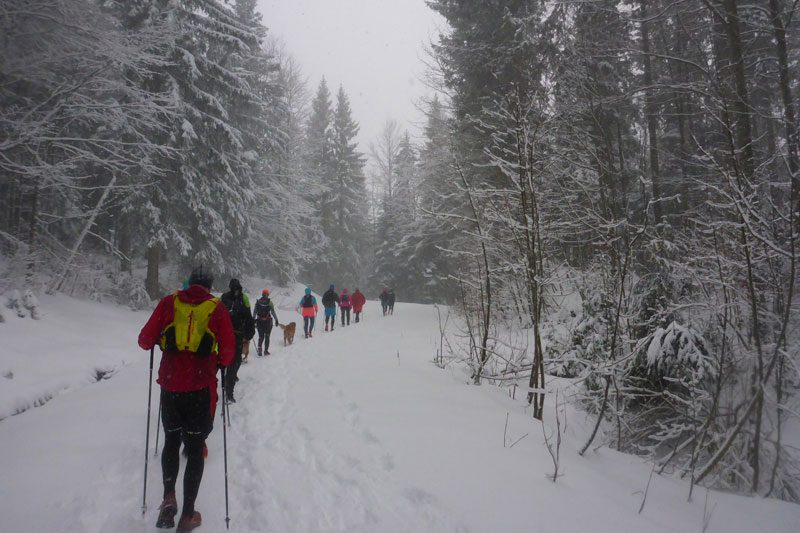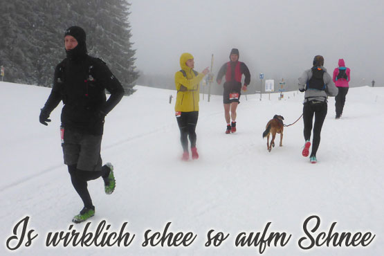 Vom Stadion weg zieht sich ein weißes, präpariertes Altschneeband durch die Landschaft, das sind die Anfangs- und Schlussmeter unserer Strecke. Es reicht immerhin um mit Spikes nicht auf dem „Trockenen“ laufen zu müssen. Die sind natürlich erlaubt, dazu auch Schneeschuhe, die man auch ausleihen kann. Selbstverständlich sind auch Stöcke oder Spikes zum Überziehen genehmigt und können natürlich auch von Vorteil sein. Wer was wählt bleibt jedem selbst überlassen. Da habe ich natürlich wieder die Qual der Wahl. Da ich ungerne mit Spikes auf nicht schneebedecktem Boden laufe (das klackert immer so nervig) und das im Tal schon danach aussieht, ziehe ich lieber die grobstolligen Trailschlappen an und packe meine portablen, aufziehbaren Spikes in den Rucksack.