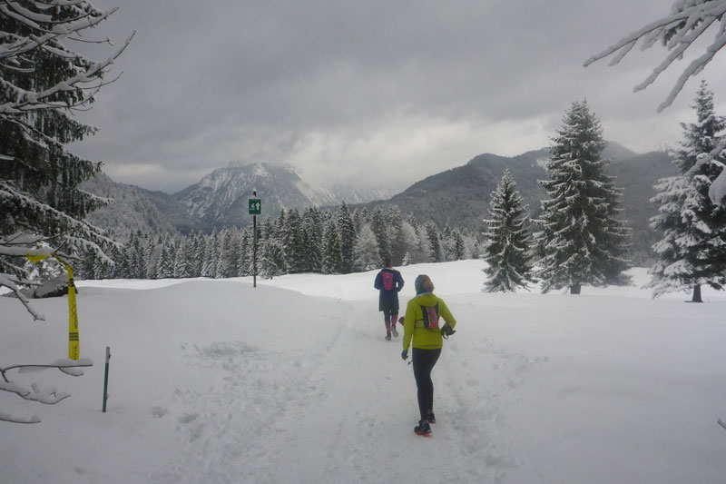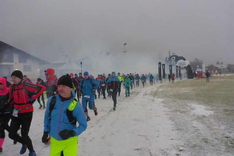 Mit Sabine fing es Anfang Februar an, ihr folgten Uta, Victoria, Wiltrud und Yulia. Viel Wind um nix, könnte man sagen, keines der Sturmtiefs hatte in den Chiemgauer Alpen für eine größere Menge Schnee gesorgt. Erst Bianca letzte Woche sorgte – zumindest auf höheren Lagen – für eine ordentliche Neuschneeschicht und ist dafür verantwortlich, dass wir heute auch einen richtigen Wintertrail genießen können. Eigentlich ist Reit im Winkl wegen seiner schneesicheren Lage auch als „Schneeloch“ bekannt, leider schaut’s im Tal nicht ganz so rosig aus. Aber Sturmtief „Elli“ zieht heute durch und fast pünktlich zum Start fängt es auch hier unten an zu schneien.