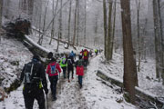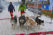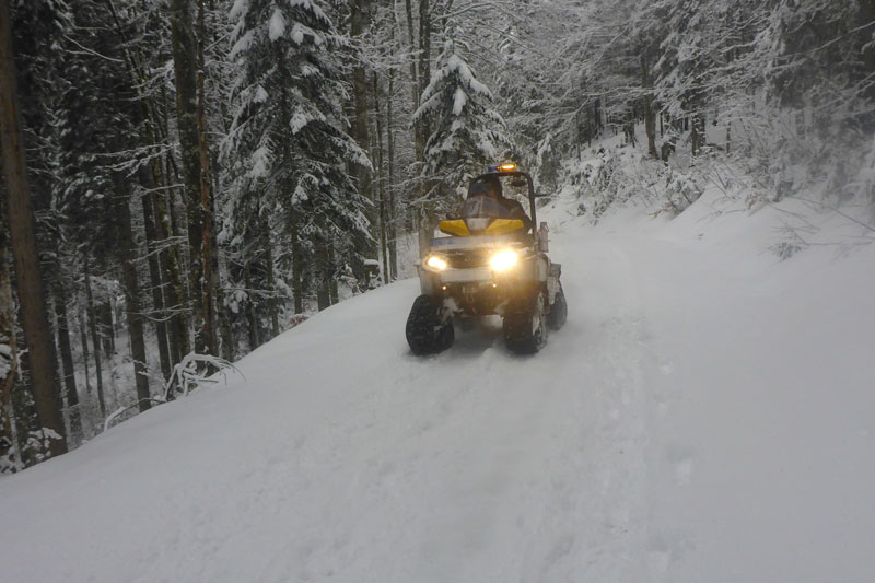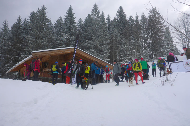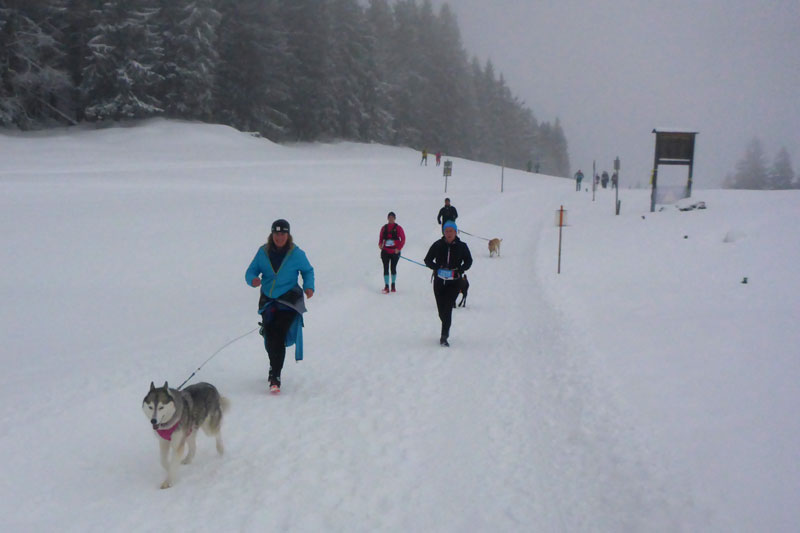 Nach den ersten Aufstiegsmetern sind wir bereits mitten drin im Winterwonderland. Ja, so schaut’s halt aus, wenn normal Winter herrscht. Einfach schee. Je höher wir aufsteigen, umso höher wird auch der Schnee auf dem Weg. Eine kurze Bachüberquerung stellt das Teilnehmerfeld vor eine unvorhergesehene Herausforderung. Obwohl bloß einen Meter breit, ist es doch ziemlich eisig und vor allem die Hunde müssen hier geführt werden. Den kleinen Stau können die meisten verkraften, aber einer ist auch dabei, der sich da vordrängeln will.