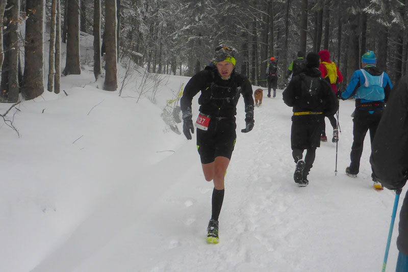 Bei km 7 haben wir bereits den strengsten Teil unserer Aufstiegsmeter für heute gemeistert, mit über 600 Höhenmeter ist der Aufstieg ab den Schanzen gespickt. Kurz vor der Hindenburghütte kommen uns bereits die Führenden der „M“ und auch der L-Strecke entgegen. Das ist ganz schon heftig, was die Jungs und Mädels da an der Spitze abziehen. Ein paar ganz Harte sind sogar in kurzen Shorts unterwegs.