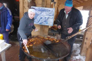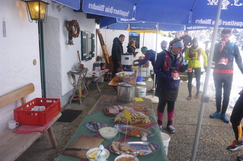 Vor der kleinen Hütte des Chiemseeblick-Biergartens wartet die erste Verpflegungsstation auf uns. In einer großen Pfanne bruzelt hier Günter seine fast schon legendären Gemüsepflanzerl. Ich hab sie schon öfters kosten dürfen, beim Trail im Sommer werden sie uns auch immer serviert, so konnte ich mich schon vorab darauf freuen. Ich muss sagen, sie schmecken am Vormittag genauso lecker, wie an einem Sommertag am Ende des Laufes. Nur eines kann meine Stimmung etwas trüben, eigentlich würde man direkt von der Hütte hier freien Blick auf den Chiemsee haben. Ich stehe hier jetzt schon zum dritten Mal und sehe wieder mal nix.
