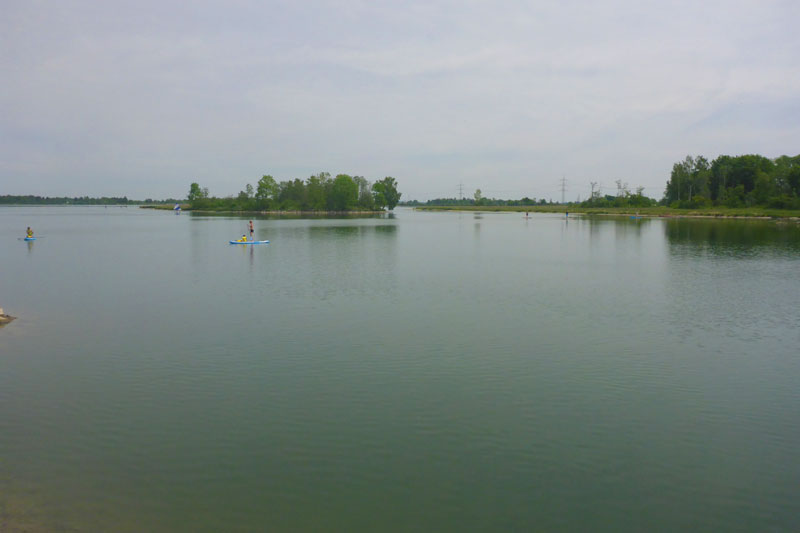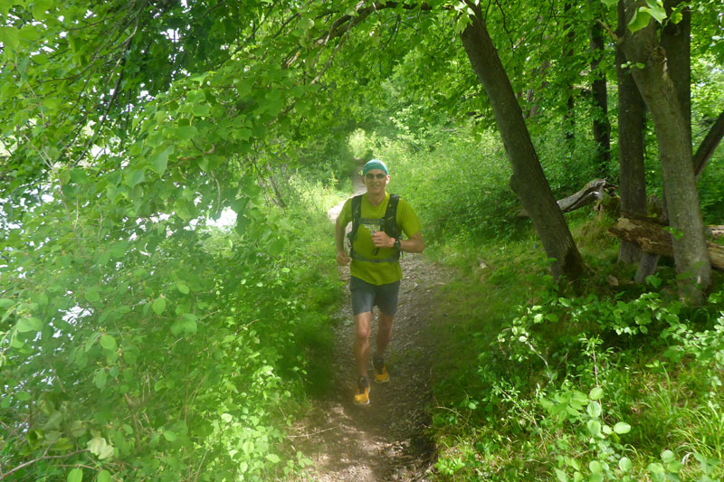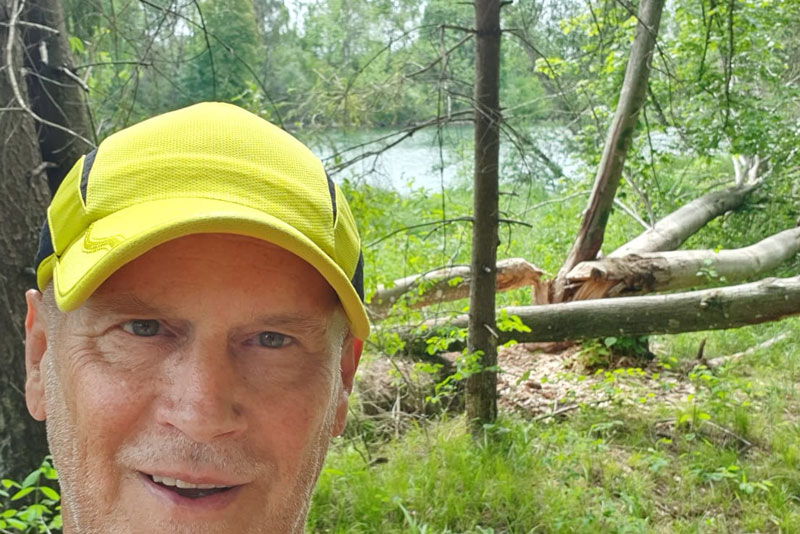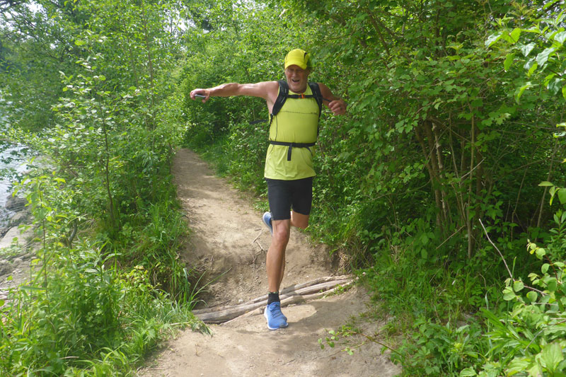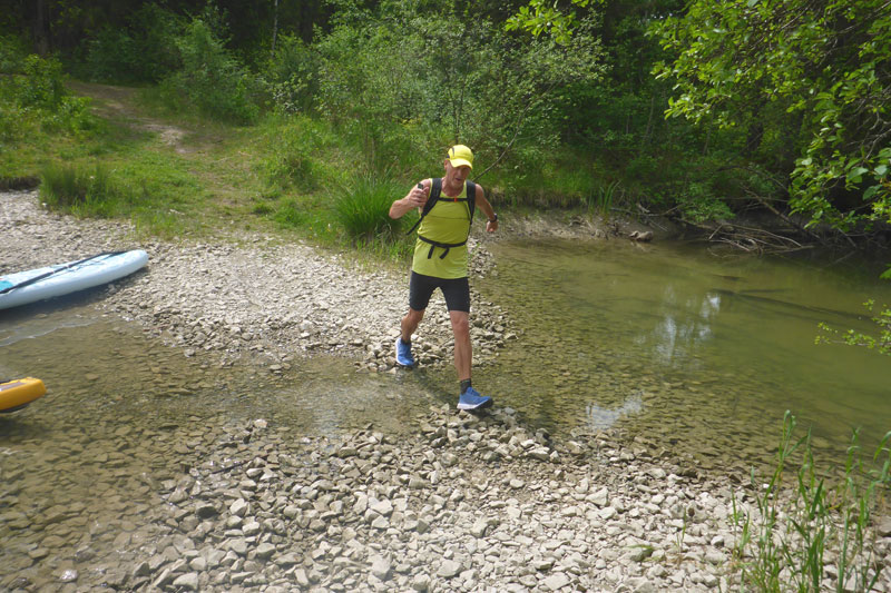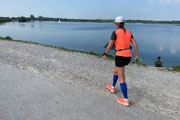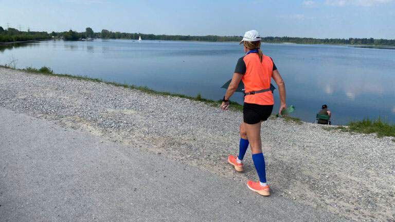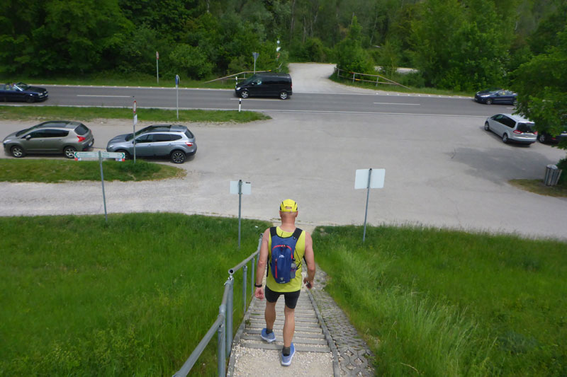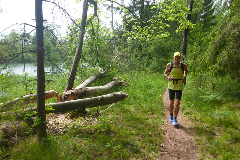 Nach 3,5 km überqueren wir die Verbindungsstraße zur B17. An der Lechstaufstufe 23 geht’s nach oben und in der prallen Sonne am Mandichosee entlang. Von noch weiter oben wird uns ordentlich eingeheizt. Für die SUP-ler auf dem See ist das bestimmt recht angenehm. Aber ich will mich nicht beklagen, mir gefällt es so auch. Nach halber Umrundung geht’s auf Höhe Vogelschutzgebiet nach rechts in das schmale Waldstück direkt am Lechufer entlang. Hier beginnt einer der schönsten Streckenabschnitte, den uns der Marathon am Lech bieten kann. Margot und ich haben ihn vor vielen Jahren Biberweg getauft, weil sie damals sehr aktiv waren und immer irgendein abgenagter Baumstamm uns zu Kletterpartien zwang. Heute kann ich auf unserem Bibertrail nicht einen einzigen bearbeiteten Baum entdecken. Ob‘s hier überhaupt noch welche gibt? Man könnte ihn aber auch umgehen und auf Feldwegen am Waldrand entlang bis zur ST22 laufen. Wer’s macht, der verpasst was.