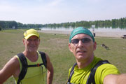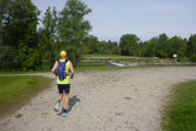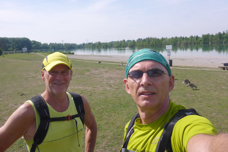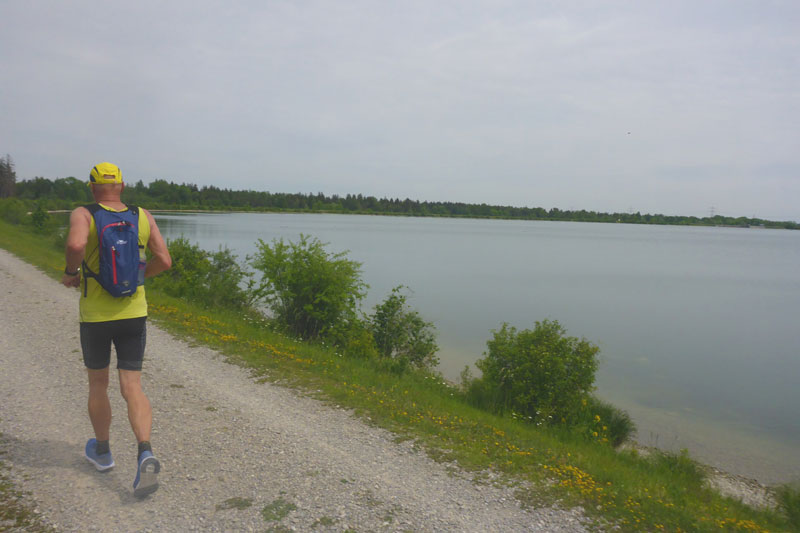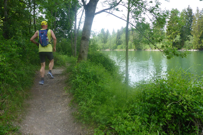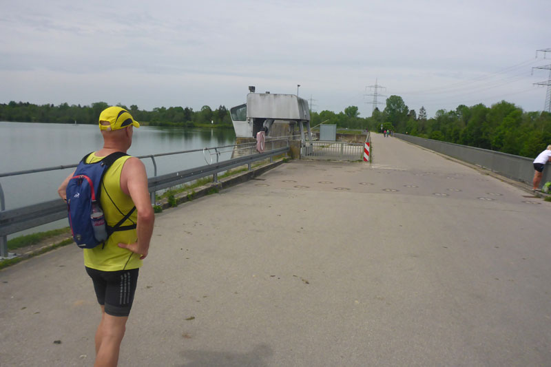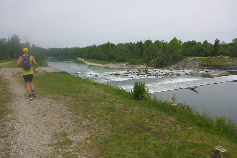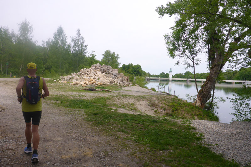 Die ursprünglich geplante Umrundung des Weitmannsee kann ausfallen, da meine vermessene Strecke etwa 45 km aufweist und ich davon etwas abknabbern will, um näher an die 42,2 km ranzukommen. Wir laufen am Weitmannseeostufer entlang und wechseln zum nächstmöglichen Wehr an den Lech. Ich werfe einen Blick auf mein GPS …Mist, ich hab vergessen es zu starten. Aber Charly hat ja die gleiche Strecke, 1,7 km muss ich hinzurechnen.