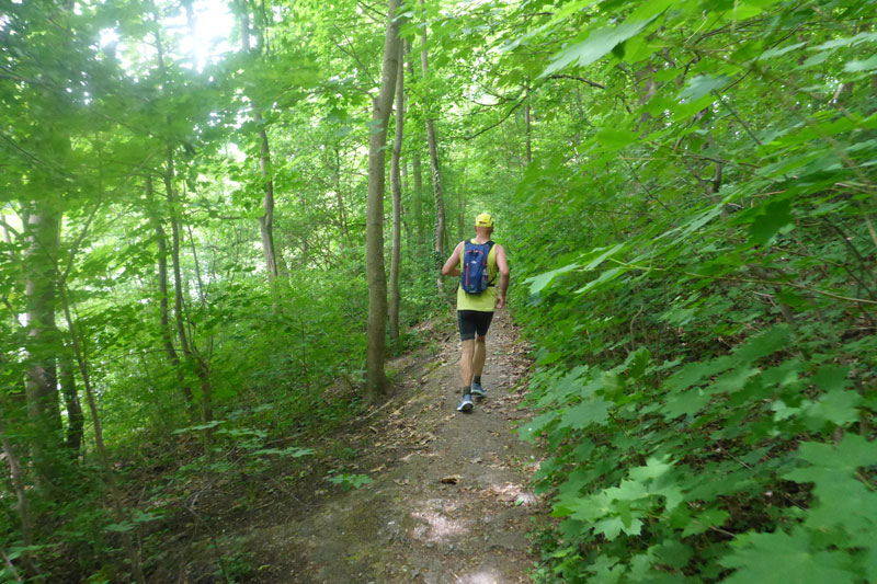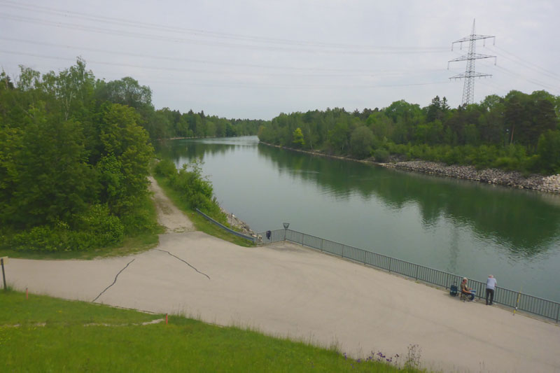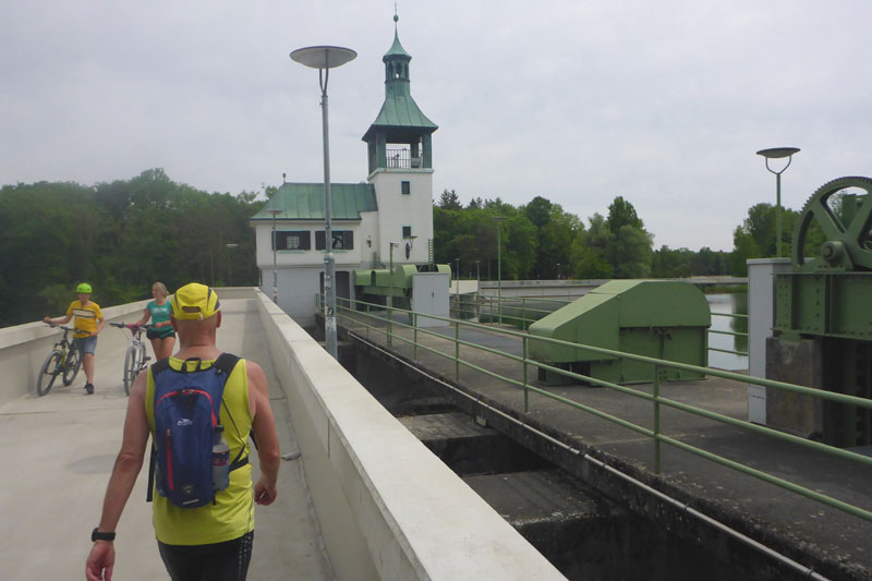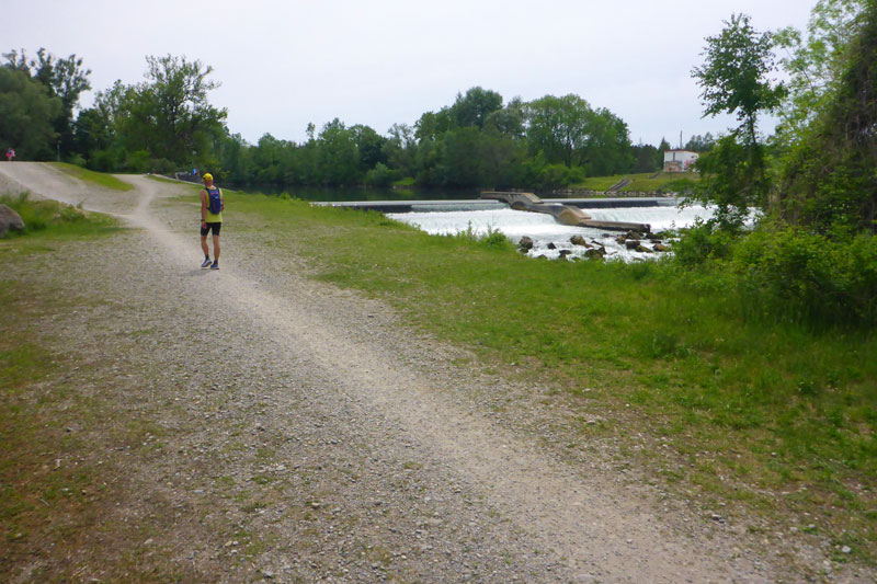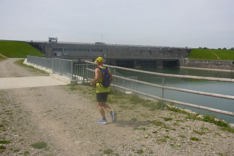 Um wieder einen Kilometer einzusparen laufen Charly und ich nur bis kurz vor die Staustufe 21 und drehen dann wieder um. Zudem ist mir der Abschnitt im Wald durch das ehemalige Bundeswehr-Sperrgebiet an der früheren Einflugschneiße der Starfighter und Tornados nicht interessant genug, wir bleiben lieber auf den Trails und am Wasser.