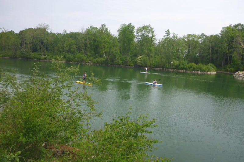 Wir wechseln über den Hochablass erneut die Seite, an der „Schwarzen Kiste“ wartet nochmals ein Radler auf Charly. Die Dammstraße böte sich jetzt an für die Schlusskilometer, aber nix da, wir laufen wieder am Lechufer entlang. Kurz vor dem ersten Lechwehr hat sich der Lech einen kleinen Canyon in die Landschaft gespült. Über große Steine balancieren wir 3 Meter über den Einschnitt. Ein Trail führt aber auch um diese Wasserlandschaft, man kann ihn leicht umgehen.