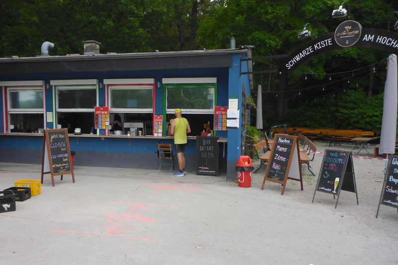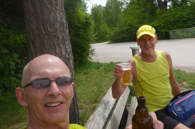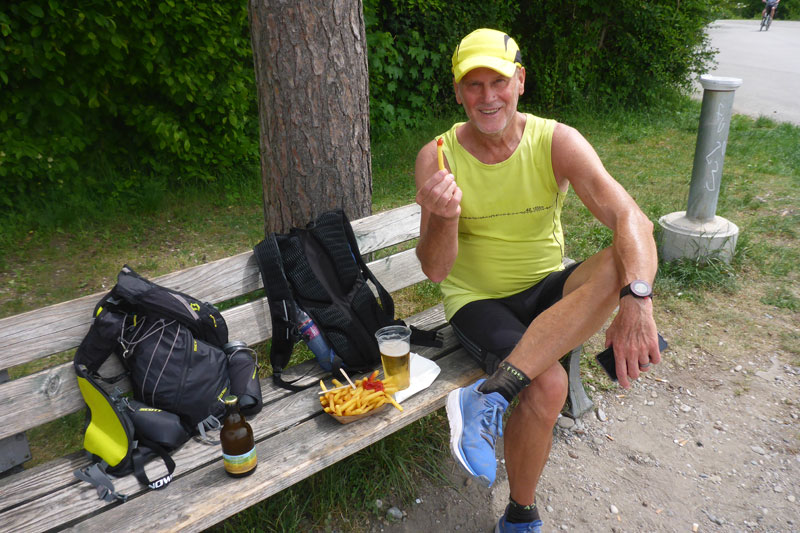 Wir benötigen jetzt dringend eine kühle Erfrischung. Wir überqueren den Hochablass und genehmigen uns eine kurze Pause an der „Schwarzen Kiste“, dem Kiosk am Kuhsee. Ein kühles Radler löscht unseren Durst. Charly gönnt sich noch eine riesige Portion Pommes. Wenn wir schon mal übergewechselt sind bleiben wir gleich da, weiter geht’s auf der Ostseite. Nach der Hochzoller Lechbrücke und dem Wasserkraftwerk bietet sich wieder die Möglichkeit für ein paar zusätzliche Trailkilometer. Wir wechseln vom Stefan-Höpfinger-Weg an den schmalen Trampelpfad an der Uferböschung etwas unterhalb. Am Osramsteg haben wir unseren nördlichsten Punkt erreicht, wechseln wieder die Flussseite und machen kehrt.