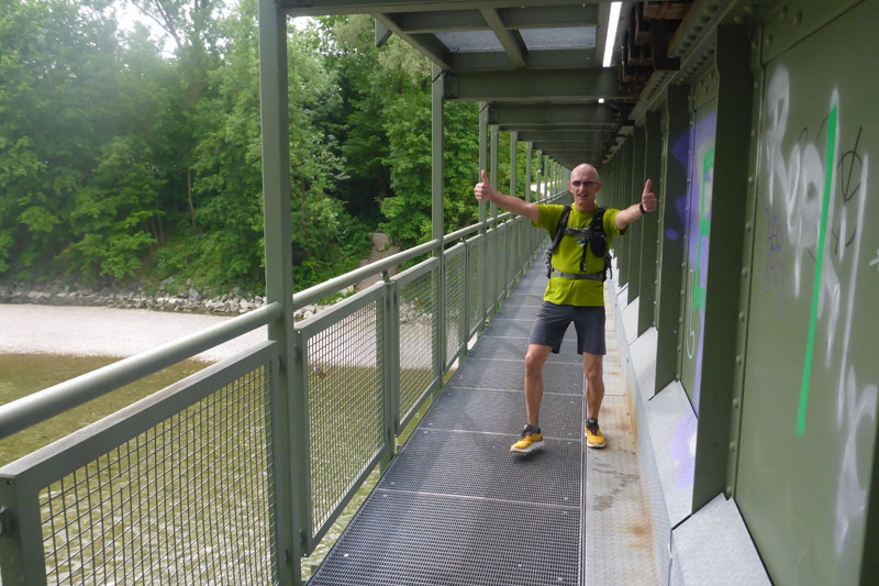 Meine Kilometerrechnung für heute ist fast genau aufgegangen, am Wehr auf Höhe Weitmannsee erreichen wir Kilometer 42,2. Ich bin immer etwas argwöhnisch ob der Genauigkeit unserer GPS-Uhren und animiere Charly auch noch die restlichen Meter bis zum Parkplatz durchzulaufen. Damit’s ja passt. Die Trail de luxe-Variante ist mega, kann ich nur empfehlen, sie bietet die ganze Schönheit des Lechs in unseren Breiten.
