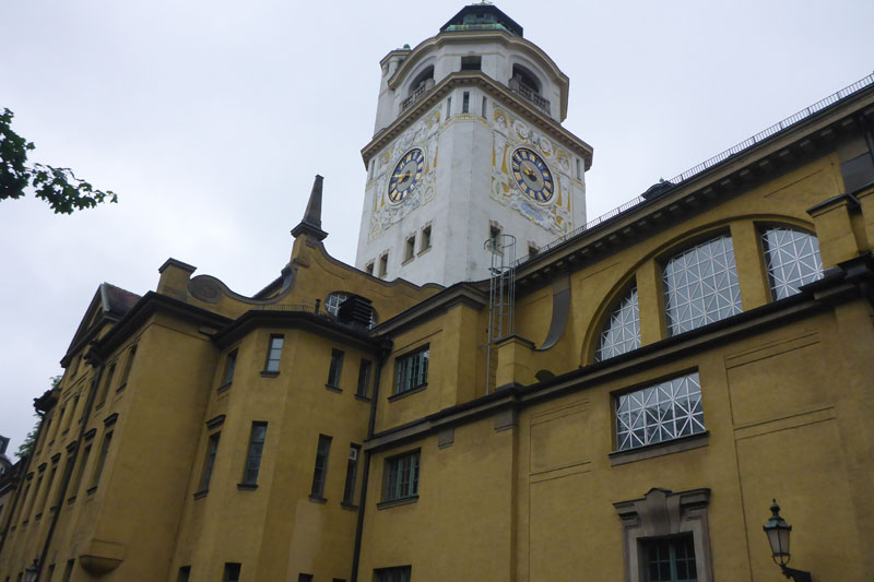 Start und Ziel ist an der Muffathalle, unterhalb der Ludwigsbrücke an der Isar. Am Feiertag ist in der Früh nix los auf den Straßen, in einer Stunde sind wir im Zentrum von Minga. Parken können wir direkt am Müller‘schen Volksbad neben der Muffathalle. Das Alter sieht man der Badeanstalt schon an, dabei war der neubarocke Jugendstilbau bei seiner Fertigstellung 1901 das größte und teuerste Schwimmbad der Welt und das erste öffentliche Hallenbad von München. Ist immer noch in Betrieb, aber natürlich wegen Corona gerade geschlossen.