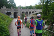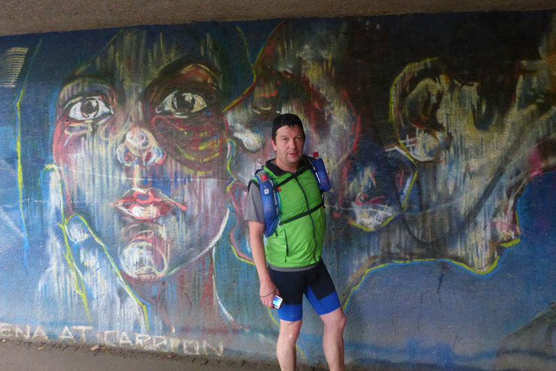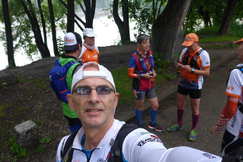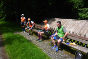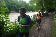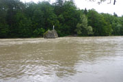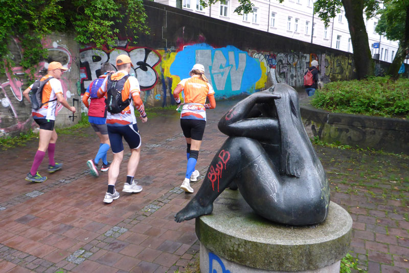 Zwischen Km 14 – 18 sammeln wir insgesamt fast 200 Höhenmeter ein. Wir wechseln wieder an‘s Isarufer. Im Wald neben uns gibt’s viele Trails, die werden hauptsächlich von Mountainbikern frequentiert. Wir sind aber nicht schadenfroh über die Truppe, die gerade einen Platten an einem Bike flickt. Mitten in der Isar ragt der Georgenstein in die Höhe, der Felsblock ist rund fünf Meter hoch, 8,4 m lang und vier Meter breit. Zur Zeit der Flößerei stellte er ein gefürchtetes und berüchtigtes Hindernis dar. Hier finden sich besonders heimtückische Stromschnellen im Fluss. Auf dem Stein wurde eine bemalte Blechfigur des Heiligen Georg errichtet. Wenig später sind wir an unserem südlichsten Punkt (km 17) angelangt. Jetzt geht es oberhalb der Isar wieder zurück.
